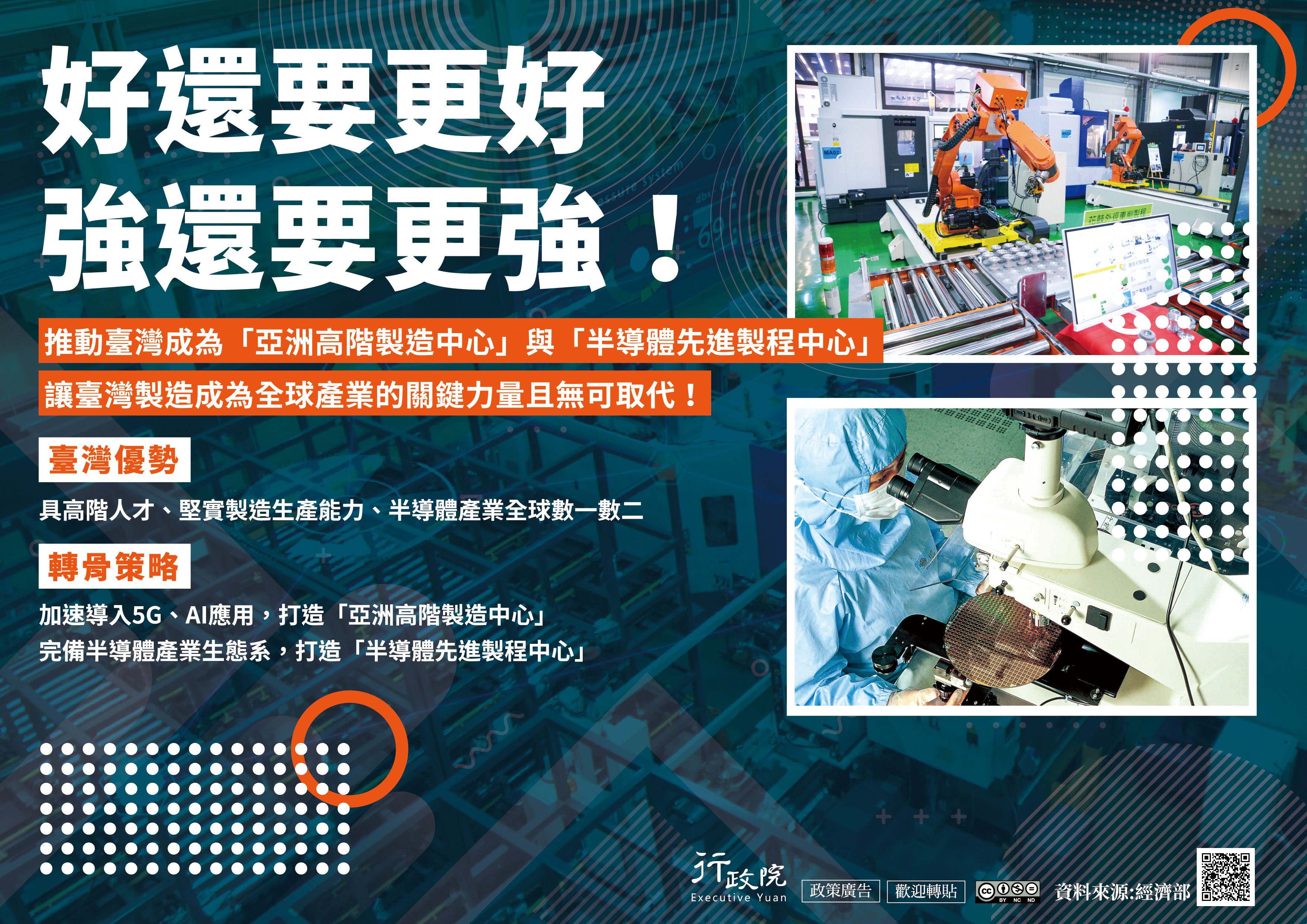 為利用臺灣堅實製造的生產能力及半導體產業優勢,帶領產業轉型,政府推動臺灣成為「高階製造中心」與「半導體先進製程中心」。