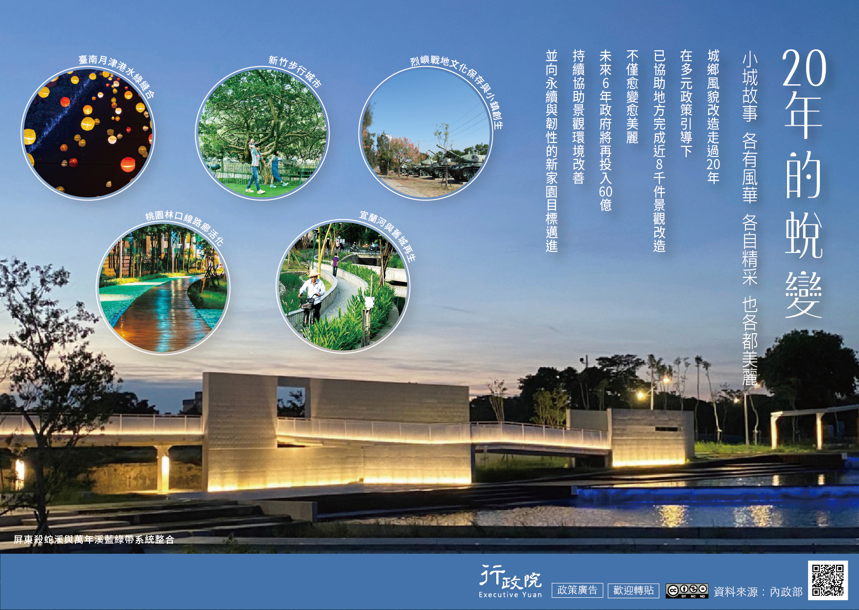 為改善臺灣城鄉景觀環境,20多年來各地方在政府多元政策引導下已逐步蛻變,並型塑出地方文化獨特又多元的特色,未來除將繼續協助鄉鎮改善空間環境,亦將支援在地創生產業加值發展,落實城鄉均衡發展,並朝永續與韌性的城鄉新家園目標邁進。 城鄉風貌改造20年