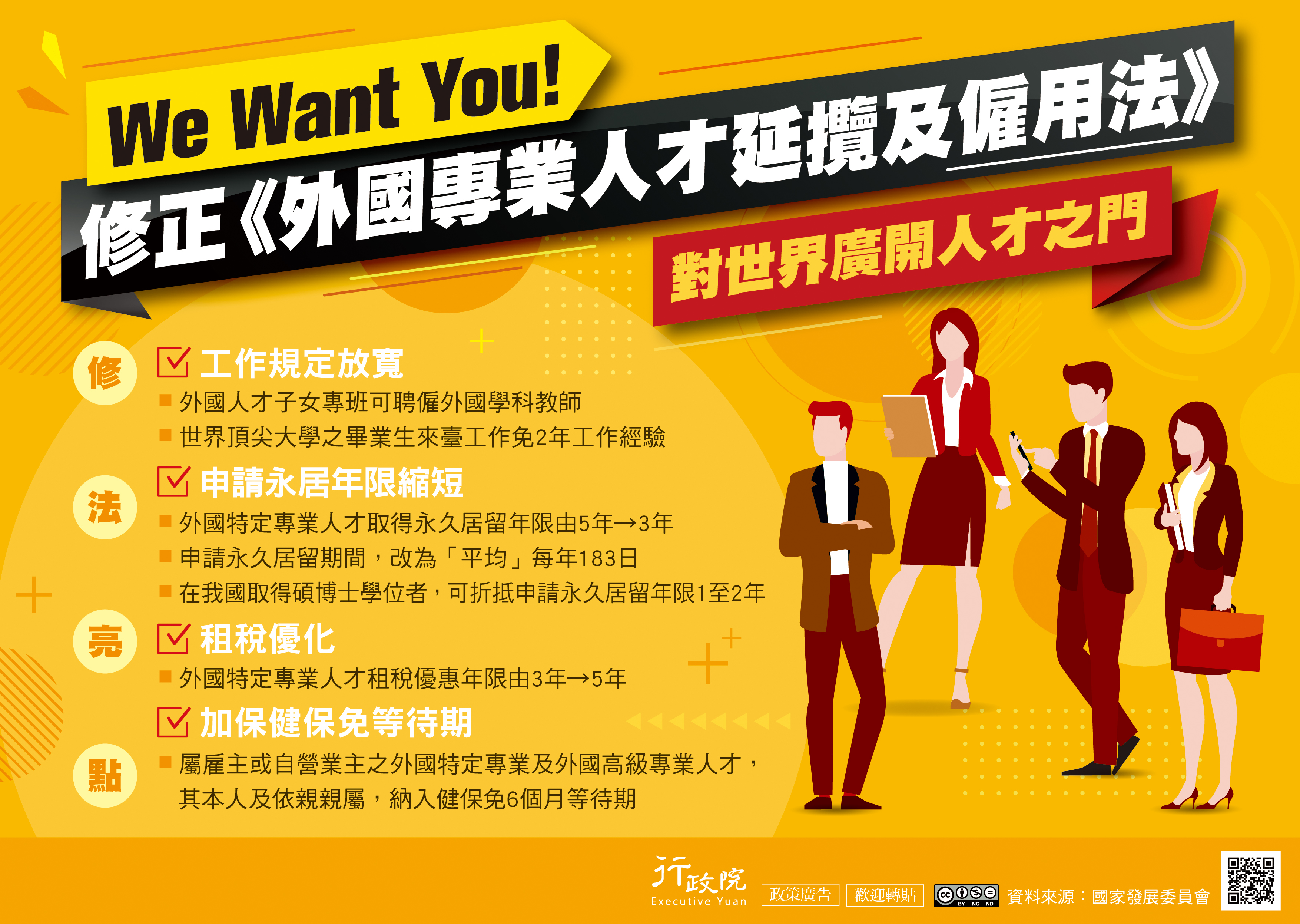 為網羅更多世界菁英來臺,增強攬才力道。政府推動《外國專業人才延攬及僱用法》修法,透過放寬工作規定、縮短申請永居年限、租稅優化、加保健保免等待期等亮點、提高國際優秀人才常留台灣誘因、讓人才「進得來」、「留得住」。 《外國專業人才延攬及僱用法》修正