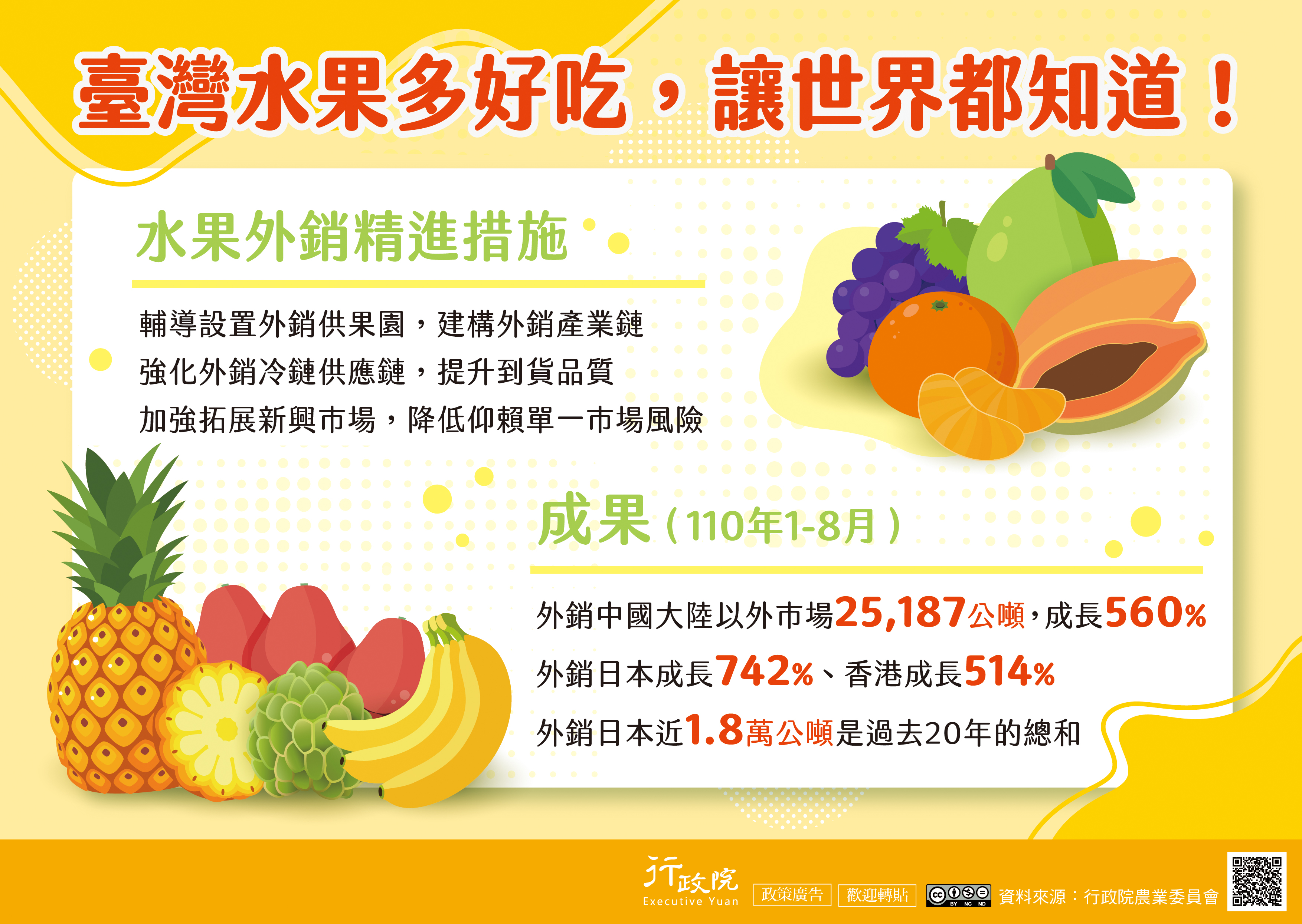 為積極開拓我國水果多元市場,政府推動「水果外銷精進措施」,從輔導設置外銷供果園,出口冷練保存及包裝明確標示產地與內容物等面向進行盤整,並加強拓展新興市場,提升台灣水果外銷競爭力,降低仰賴單一市場的風險。 水果外銷精進措施
