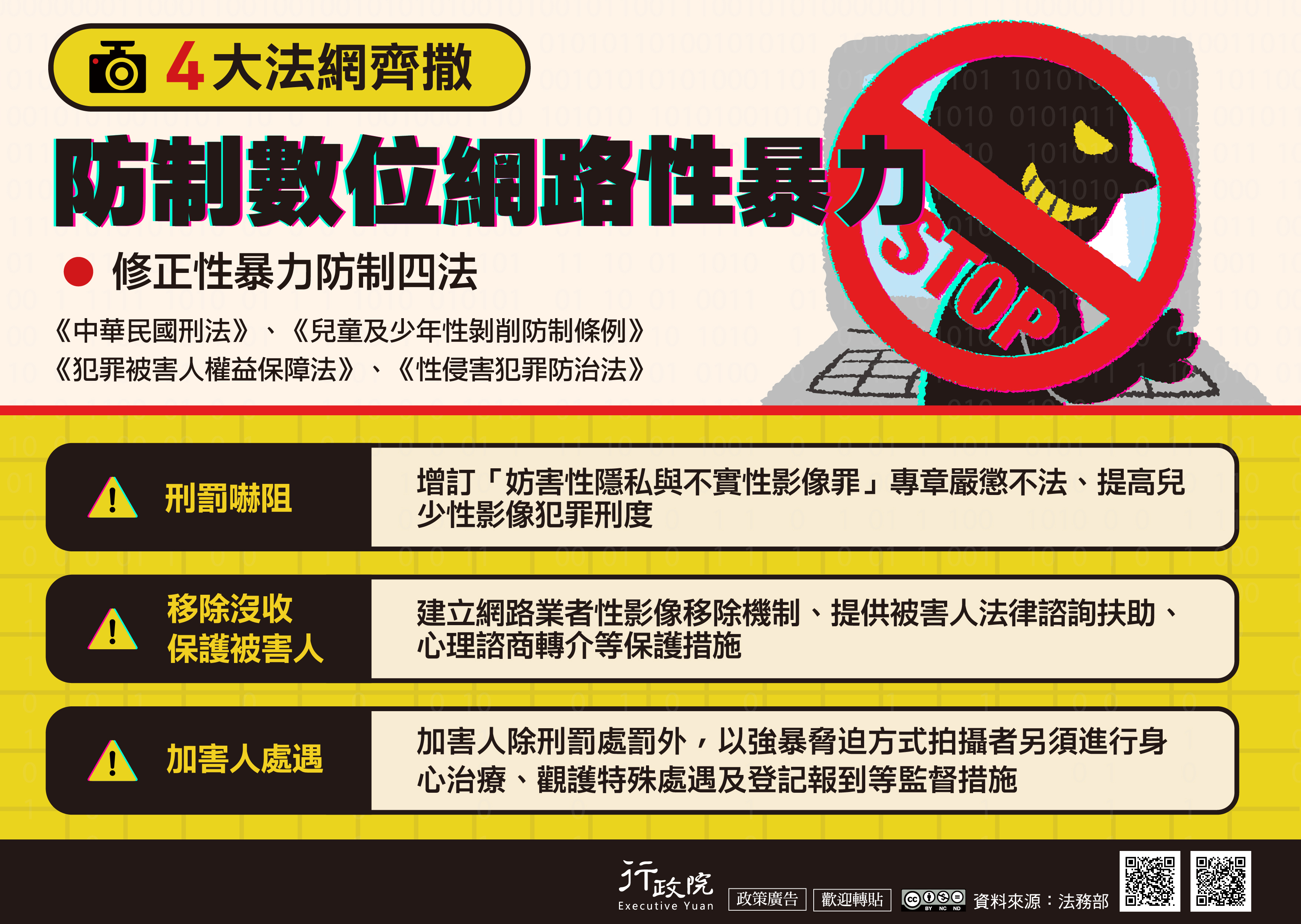 為防制網路、數位性別暴力,政府推動修正《中華民國刑法》、《犯罪被害人權益保障法》、《性侵害防罪防治法》與《兒童及少年性剝削防制條例》等性暴力防制4法,透過刑法嚇阻、移除沒收、保護被害人、加害人處遇等措施,架構更完善的性別暴力防護網絡,期有效防制性暴力犯罪。