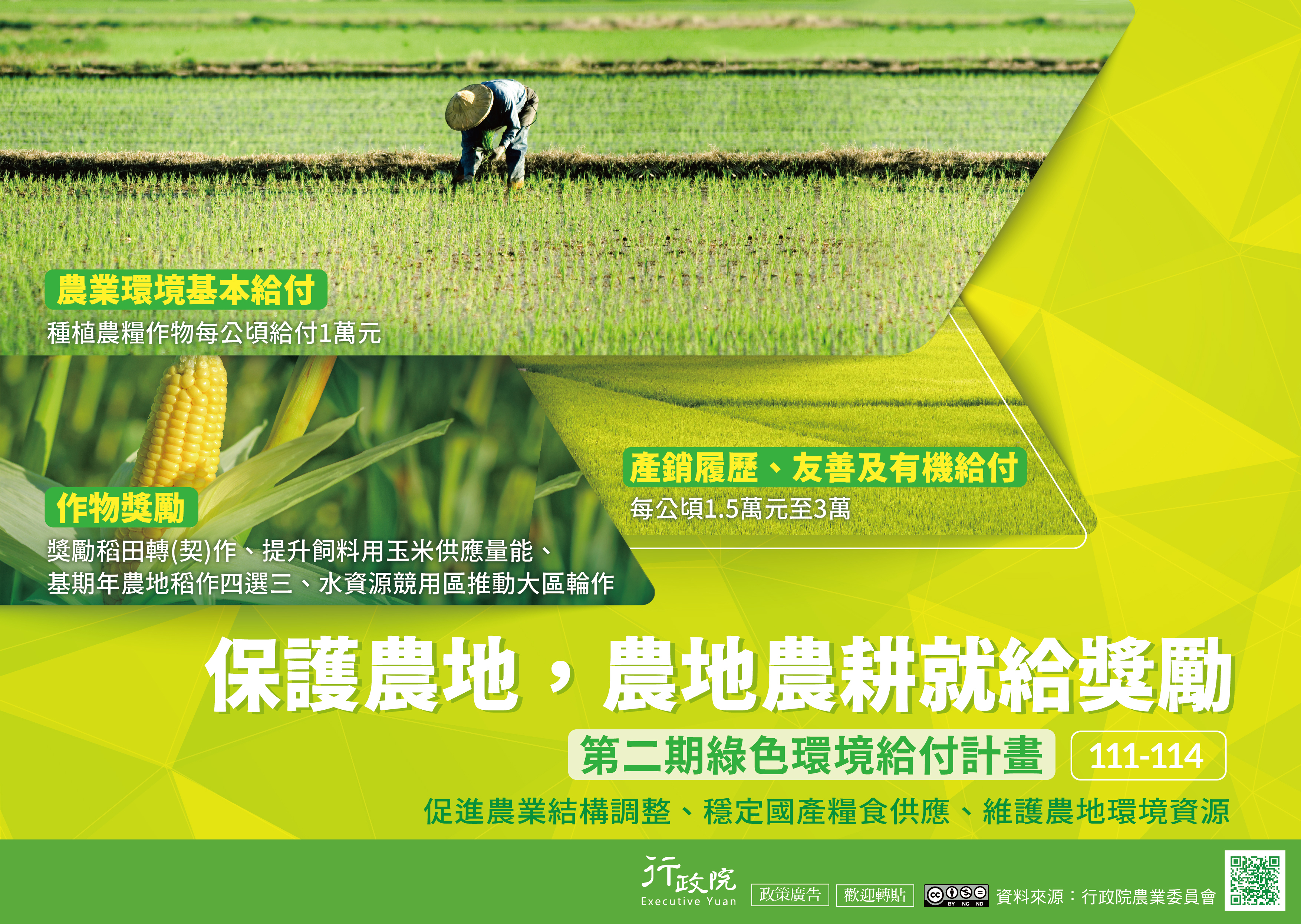 為促進臺灣農業轉型升級,政府自107-110年推動為期四 年「對地綠色環境給付計畫」,成效良好,今(111)年續 推動第二期計畫,以農業環境基本給付、作物獎勵及友善 環境補貼等措施,達到促進農業結構調整、穩定國產糧食 供應、維護農地環境資源。