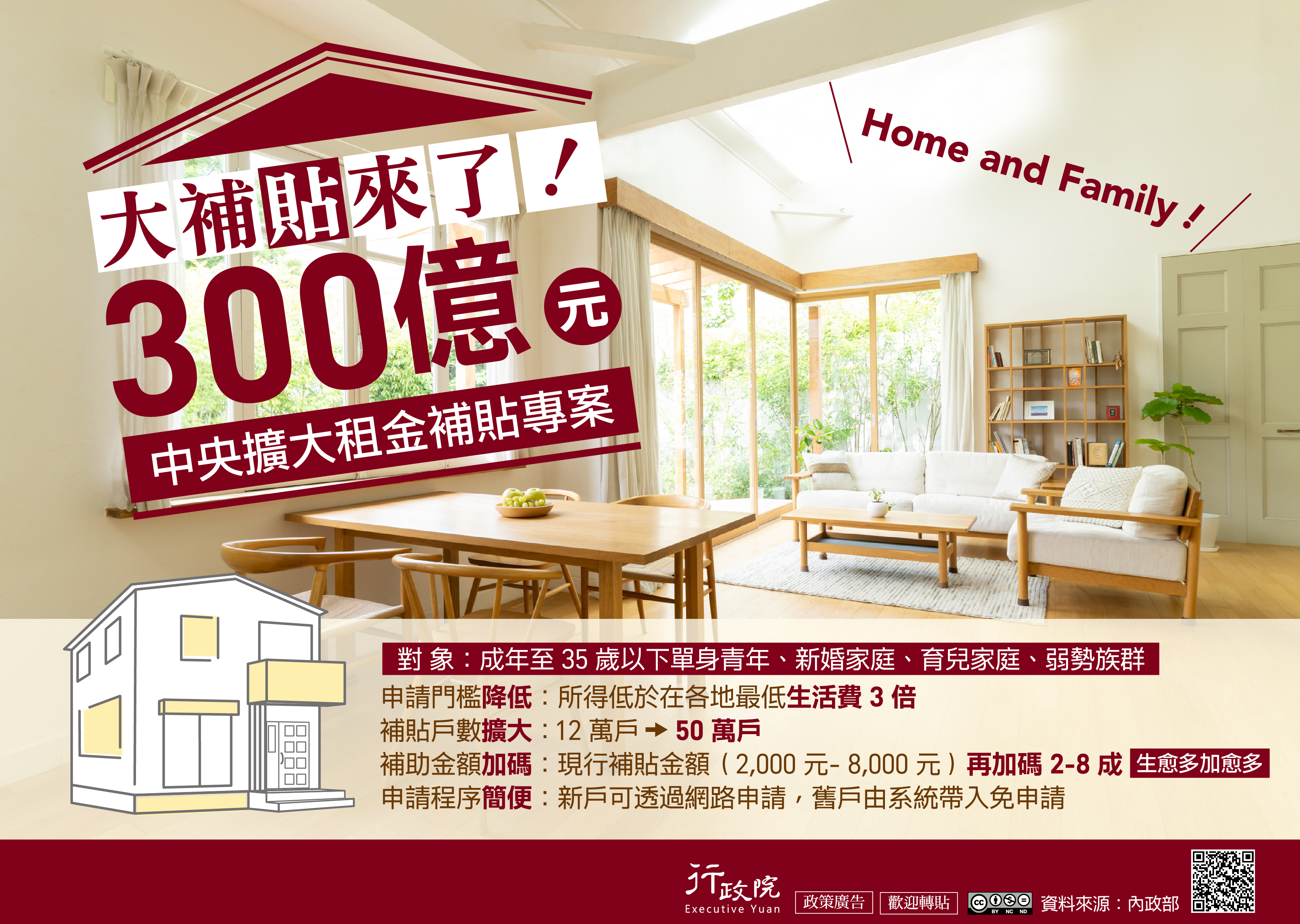 為減輕租屋家庭經濟負擔,政府推出「中央擴大租金補貼 專案」,透過申請門檻降低、補貼戶數擴大、補助金額加 碼,申請程序簡便等措施,提供單身青年、年輕家庭、弱 勢族群租屋補貼,期營造安心成家的環境及達到維護居住 正義的目標。