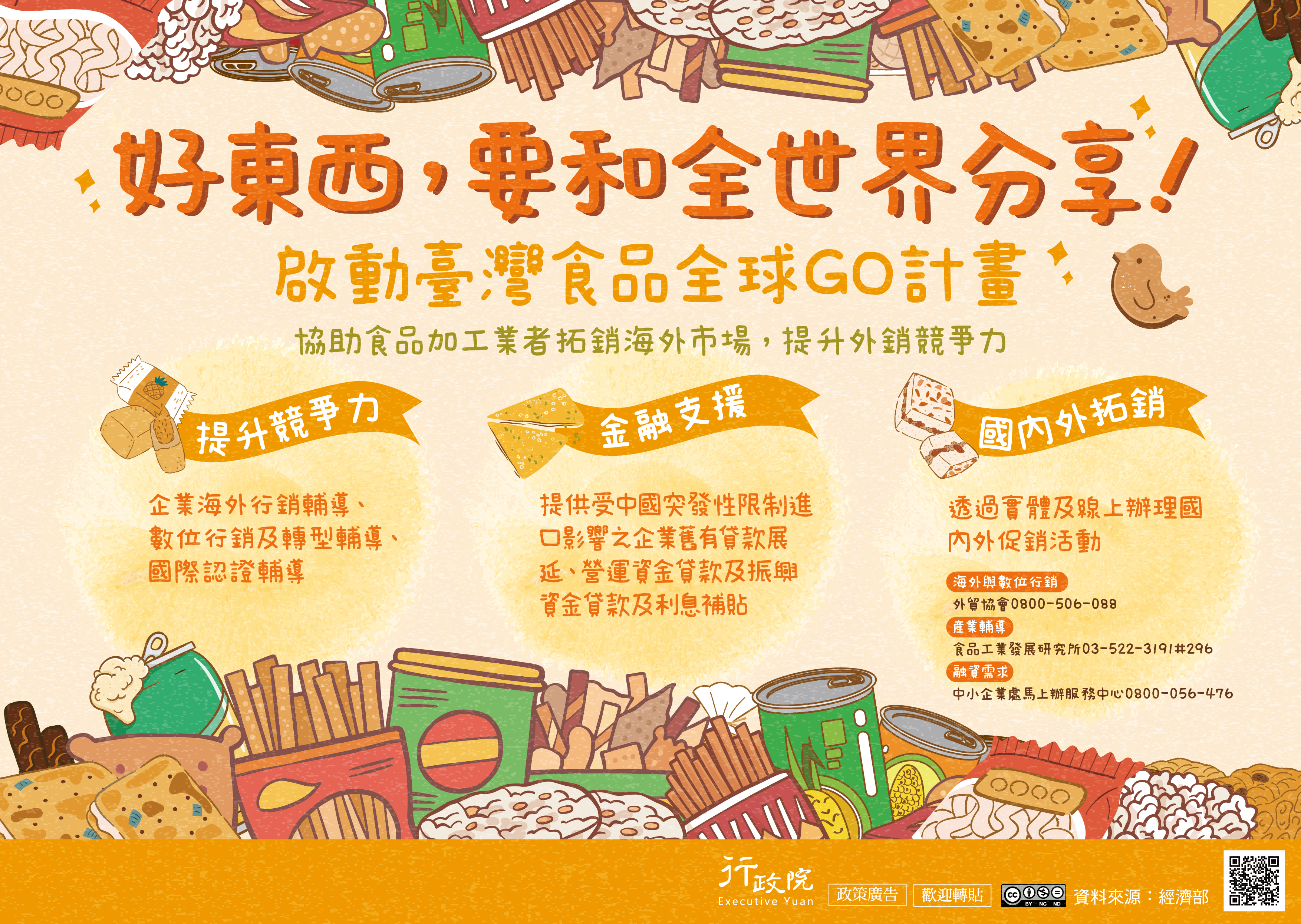 為協助我國食品業者因應中國突然性限制出口之影響,政 府啟動「臺灣食品全球GO計畫」,透過國內外拓銷、提升 競爭力及金融支援,協助加工食品業者布建國際市場通 路,分散出口市場。