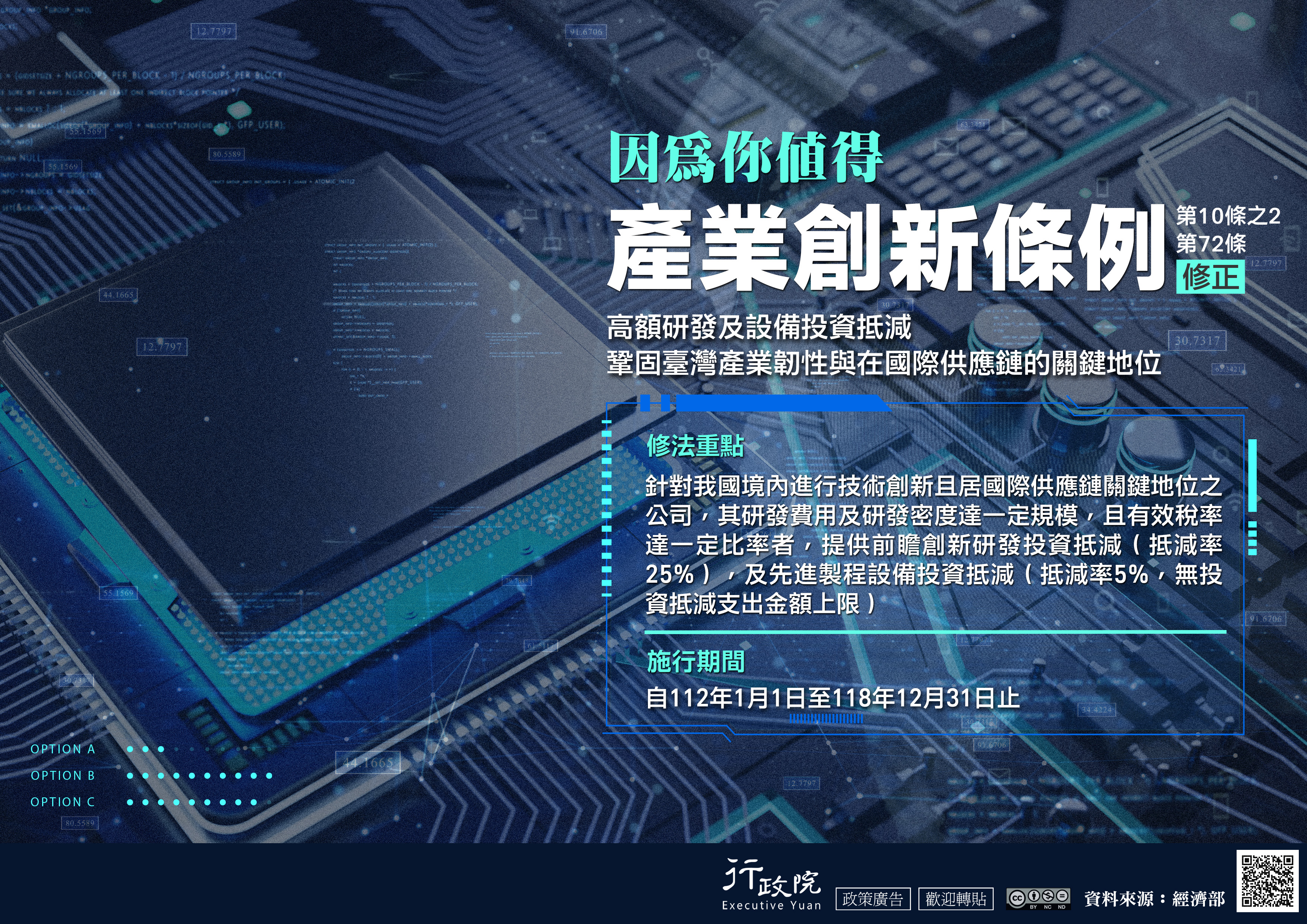 為促進下世代關鍵產業與技術持續深耕臺灣,政府推動「產業創新條例」修法,從112年起至118年止,對在我國境內進行技術創新且居國際供應鏈關鍵地位之公司,符合一定條件者,提供高額研發及設備投資抵減。