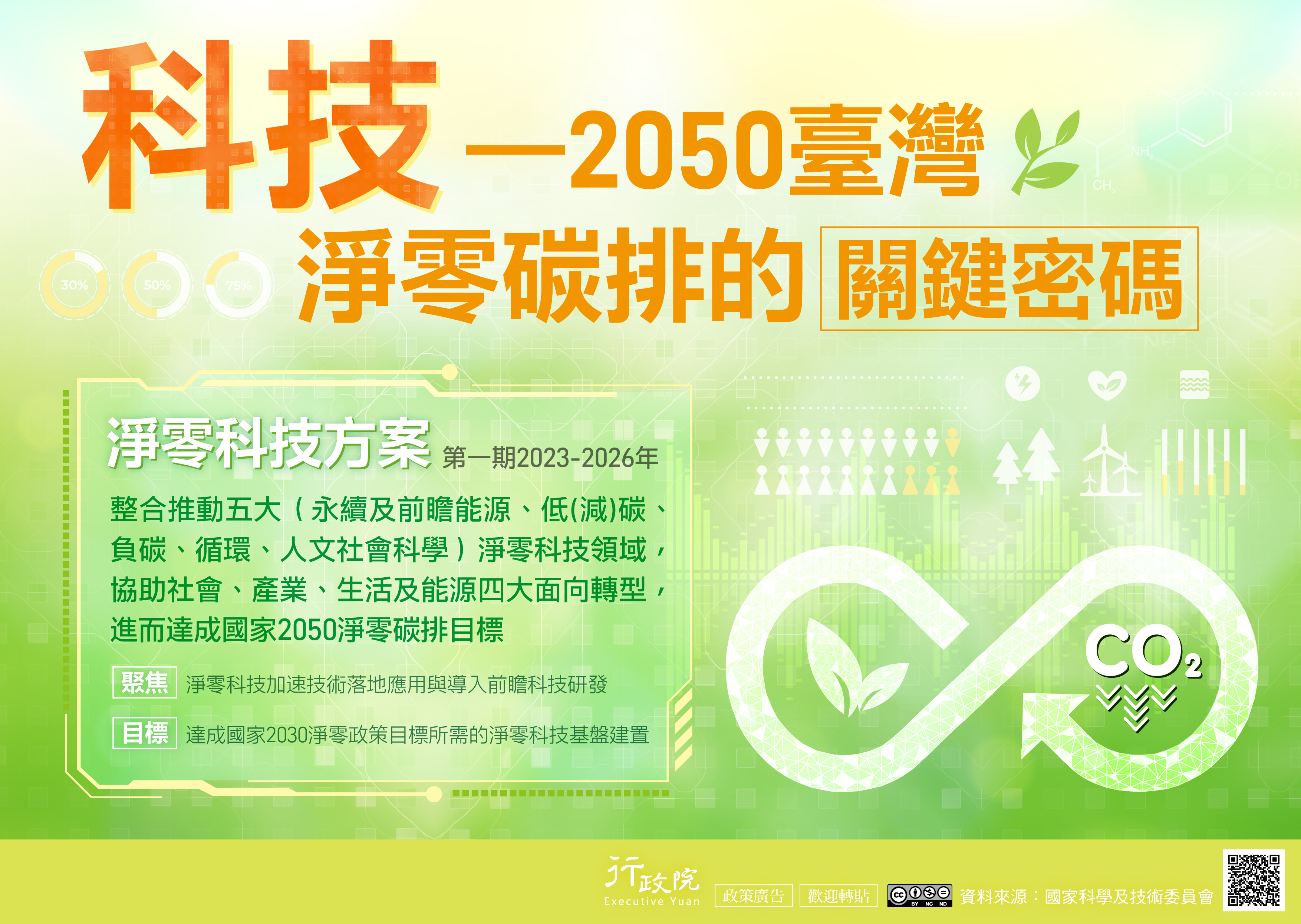 鑑於科技創新突破是臺灣2050達到淨零排放目標的關鍵,政府推動「淨零科技方案(2023-2026)」,落實相關研發與執行,打造我國成為淨零科技的典範國家。