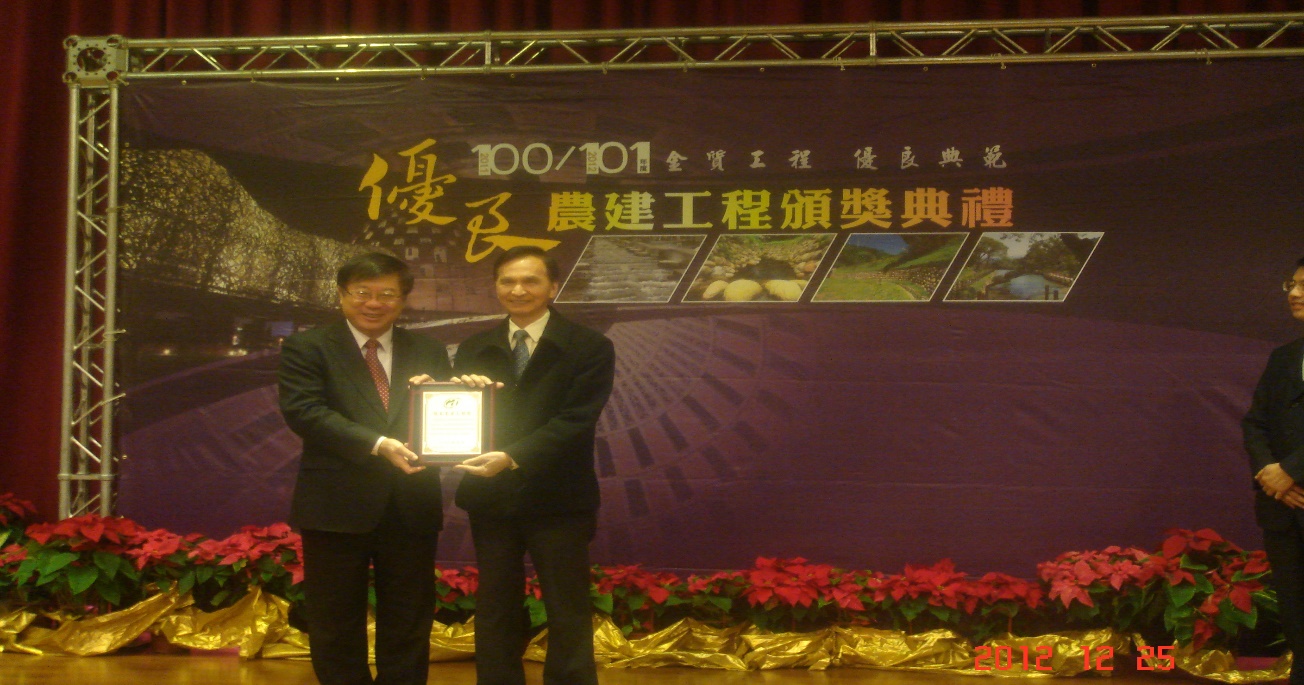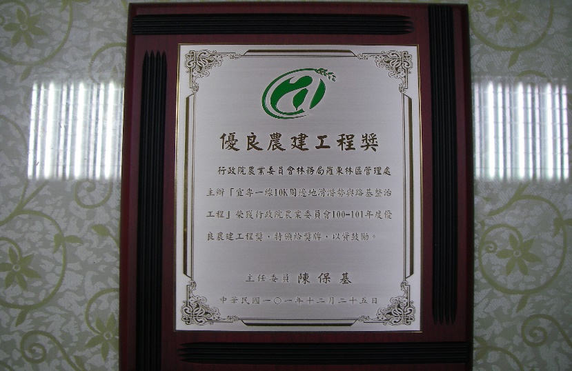 「宜專一線10k周邊地滑潛勢與路基整治工程」,於101年獲本局推薦,參加行政院農業委員會100-101年優良農業建設工程評鑑,經農委會工程品質評鑑小組初選及實地評審後,榮獲治山防災類得獎工程,並於101年12月25日假農委會國際會議廳,接受陳主任委員保基頒獎。