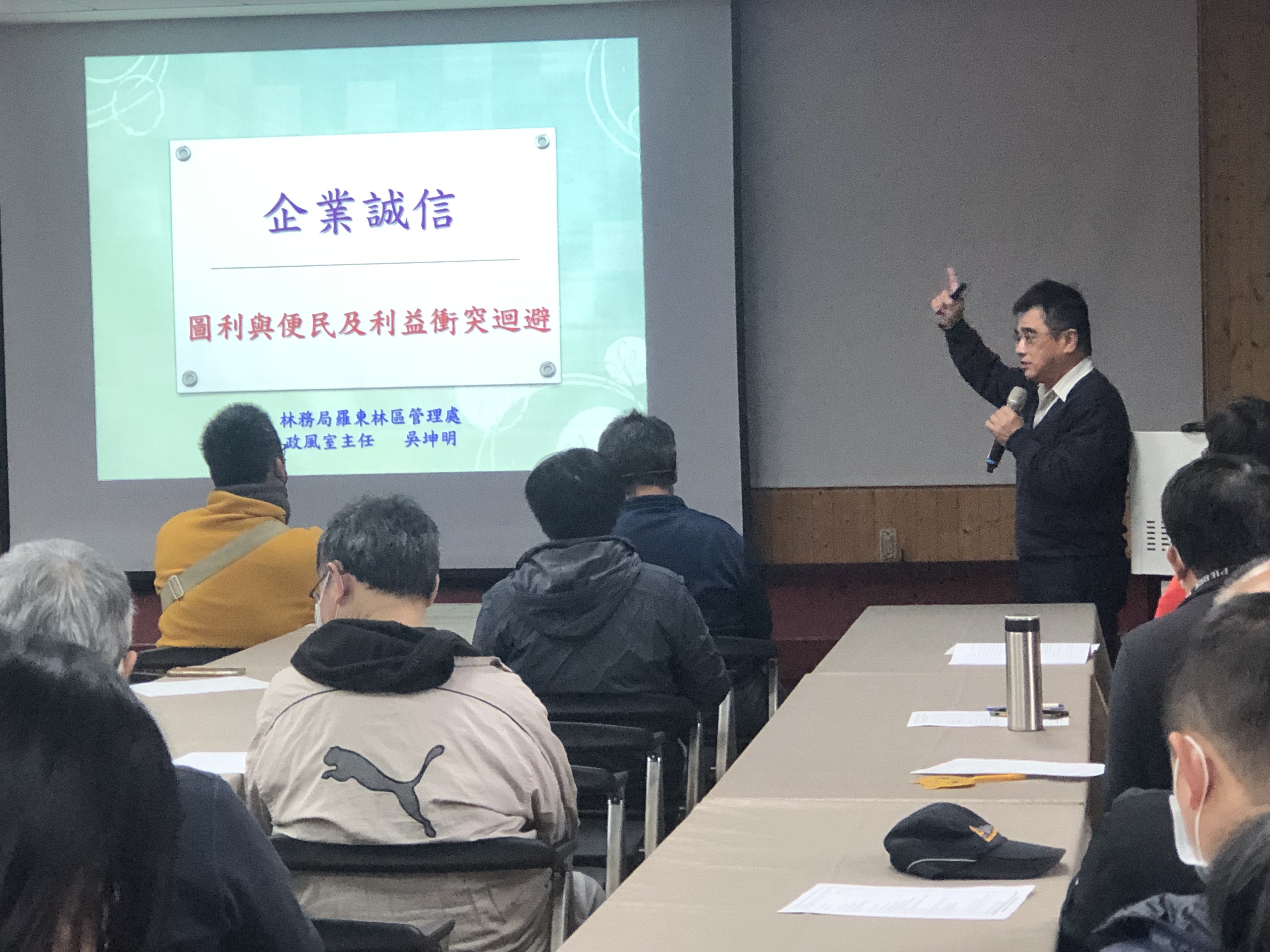 本次講習邀集承攬之工程設計、監造及工程承攬廠商參加,同時邀集轄各工作站及與工程業務相關人員參加,藉此增加廠商及同仁互動,共同建立廠商及同仁廉潔安全觀念,同時強化施工時應有職業安全衛生觀念,確保施工人員安全衛生,維護治山防洪施工品質,及強化國土保安等工作。本次活動介紹「企業誠信」、「圖利與便民」、「公職人員利益衝突迴避法」,提升企業廠商誠信理念、圖利與便民認識及利益衝突迴避規定,避免廠商及同仁誤觸法網,影響自身權益;共同提昇施工品質,建立民眾對企業及政府廉能之信賴。