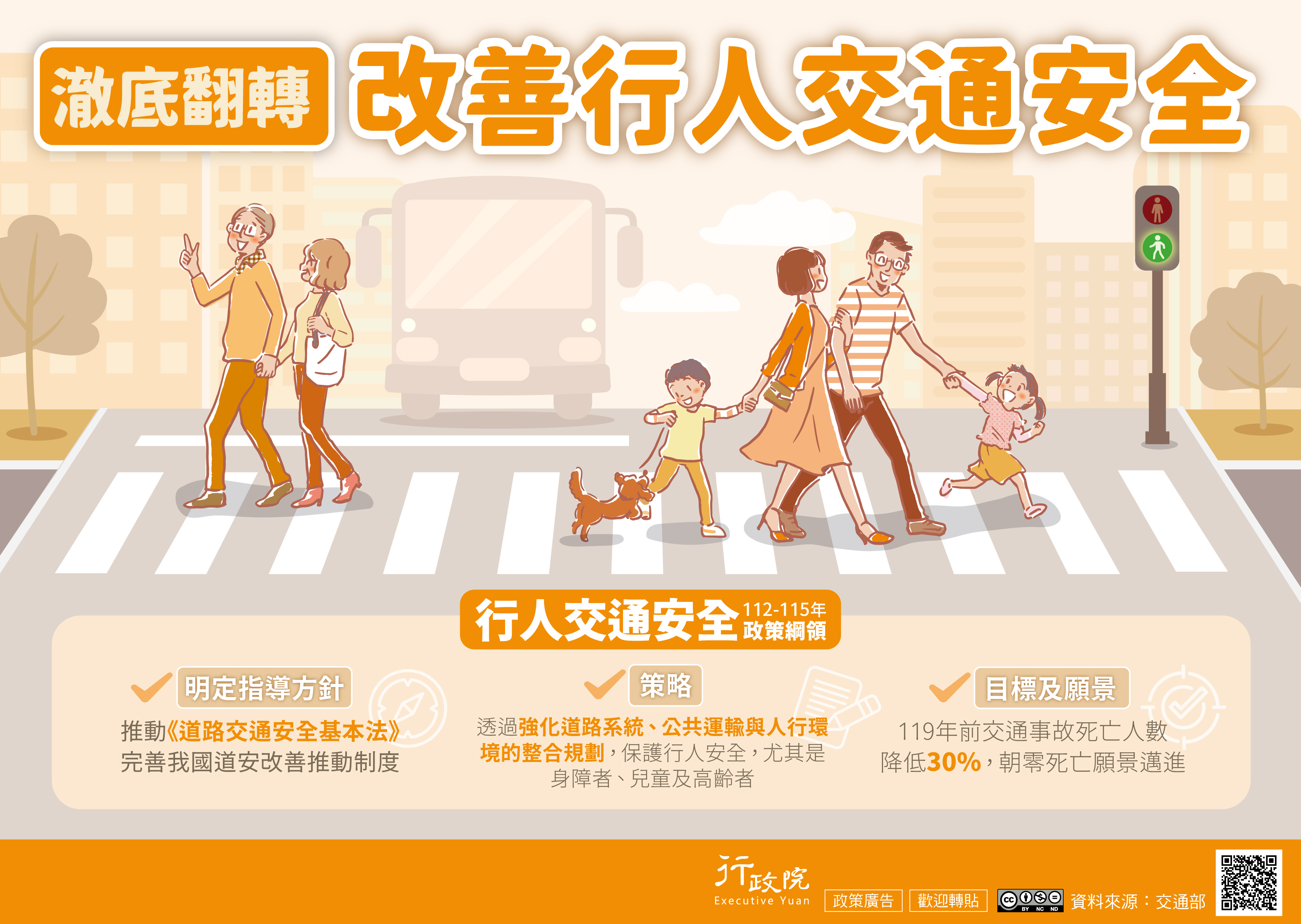為落實行的正義,政府推動「行人交通安全政策綱領」,透過強化道路系統、公共運輸與人行環境整合規劃,以澈底翻轉改善行人交通安全。