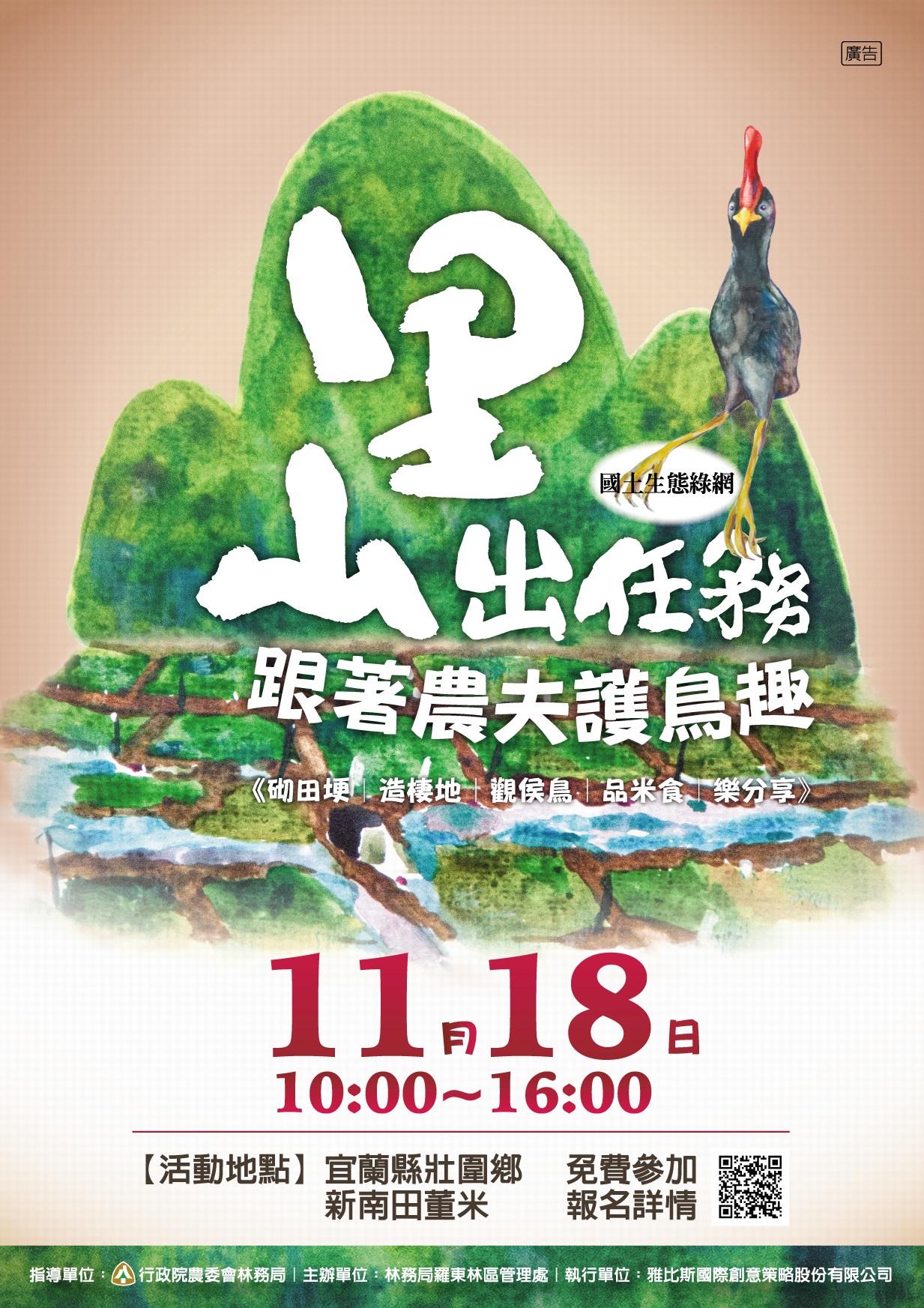 為了擴大生物多樣性保育,林務局今年啟動了「國土生態綠網計畫」,希望藉此保育僅能生存在保護區外的淺山、平原地帶的生物,同時兼顧農民生產與生活。為了讓大家了解這樣的政策理念是如何落實?羅東林管處將於11月18日(星期日)與新南田董米合作,舉辦「里山出任務—跟著農夫護鳥趣」活動,邀請30位想要了解什麼是「國土生態綠網計畫」的民眾?或者有志於透過友善生產保育生物多樣性的農友們,一同來參與。 為了推動國土生態綠網計畫,今年羅東林管處與新南田董米合作,除了一期稻作維持通過綠色保育標章的生產方式外,在二期休耕期間,再透過保留再生稻、水位調控、米糠施撒,及田埂拓寬等方式來營造適合水鳥度冬的棲地。近期,隨著天氣漸冷,許多稀有的候鳥,如:白額雁、黑嘴鷗、跳鴴等陸續飛來田董米田區的加寬田埂上棲息、覓食,似乎驗證了這樣的努力。試想,當農業生產中有了自然棲地和生物互動的畫面,產品是否也多了點生態與生活的味道呢! 為了讓更多人了解國土生態綠網政策是如何在兼顧生計的前提下一起追求環境與人類的共生共榮,羅東林管處邀請大家於11月18日一起來參加,除可由田董米負責人—林哲安的帶領解說認識水鳥、了解棲地,更可從糊田埂及造棲地的體驗,了解如何讓農業生產與自然生態保育形成良好正向循環。 線上報名網址:https://www.accupass.com/event/1810290721231551360316 詳細訊息請參考報名資訊,或羅東林區管理處網站(http://luodong.forest.gov.tw)。如欲深入了解,歡迎來電(02)7719-2111#231涂小姐。