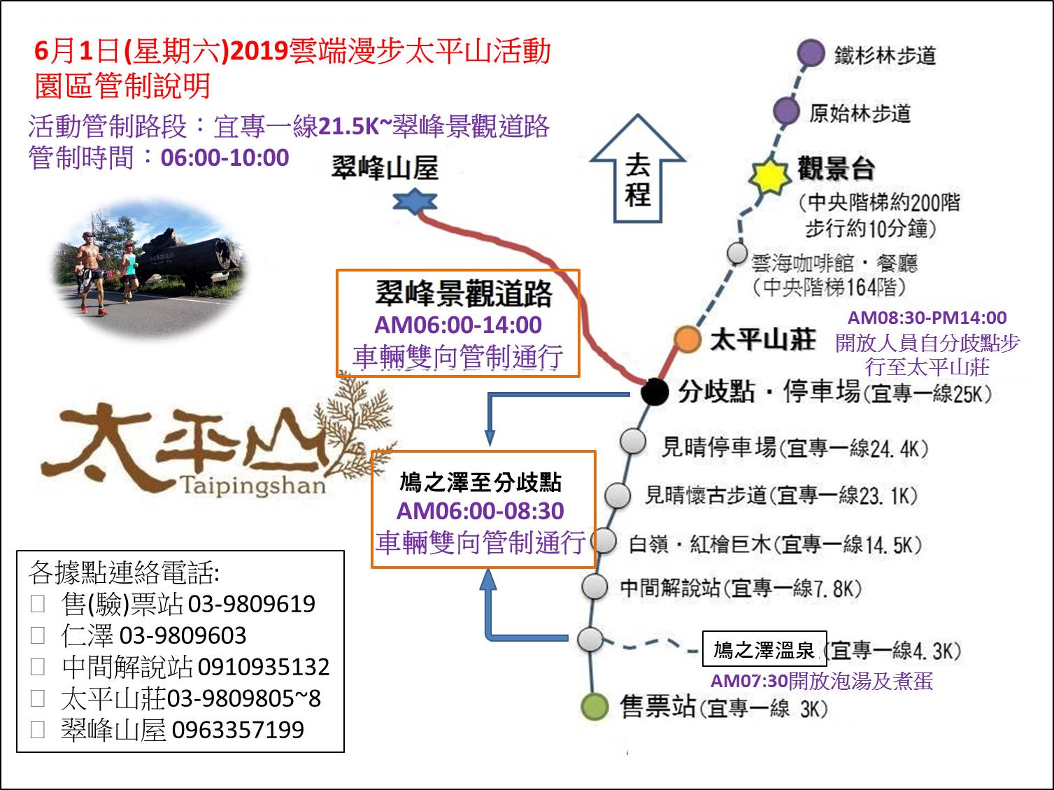 太平山2019年上半年度共受理2場次體育活動申請,分別為:1.台灣運動休閒產業協會於5月19日(星期日)辦理「2019鐵騎探索太平山」活動、2.宜蘭縣鐵人三項協會於6月1日(星期六)辦理「2019太平山雲端漫步活動」活動,辦理活動當日將實施區內道路「宜專一線」及「翠峰景觀道路」交通管制,敬請遊客配合。 「2019鐵騎探索太平山活動」訂於5月19日(星期日)上午06時至12時舉行,活動自土場騎乘腳踏車至宜專一線終點,因此當日上午6時至上午12時實施區內道路「宜專一線」全線交通管制。建議欲前往太平山莊及翠峰湖區域的遊客可提早於上午4時至6時入園或等待至中午12時活動結束後入園。 「2019太平山雲端漫步活動」訂於6月1日(星期六)上午06時至14時舉行,因路跑路線涉及區內道路「宜專一線」及「翠峰景觀道路」,管制時間分別為宜專一線上午06:00-08:30實施雙向管制、翠峰景觀道路上午06:00-14:00實施雙向管制。遊樂區內溫泉區因僅距售票站1.3公里,活動當日提早於上午7點30分後開放遊客泡湯及煮蛋。 活動管制詳情將於太平山FB粉絲團(http://www.facebook.com/tps100.forest/)、台灣山林悠遊網(http://recreation.forest.gov.tw/)及太平山森林遊樂區專網(http://tps.forest.gov.tw/)發布,或仍有相關活動交通管制問題,可洽太平山服務站(電話03-9809805)或太平山售驗票站(電話03-9809619)詢問。
