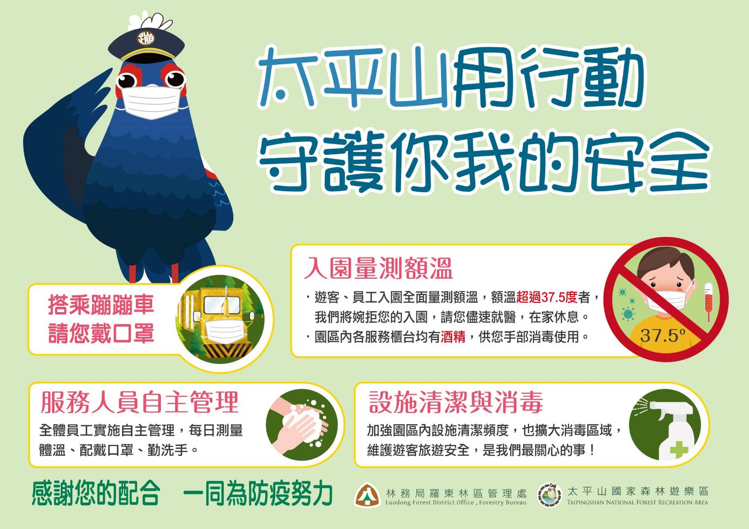 因應新冠病毒疫情再度升高,中央流行疫情指揮中心自5月11日下午2時起至6月8日,提升疫情警戒至第二級,太平山國家森林遊樂區除了加強各據點環境的消毒工作外,配合全國防疫工作自110年5月11日下午3時起實施以下各項措施: 1.入園實名制登記,並持續實施體溫控管,額溫量測達攝氏37.5度以上者,不予入園。 2.入園人數達1,800人即進行入園管制。 3.各據點皆準備酒精提供遊客消毒使用。 4.區內公廁全面提供洗手乳,鼓勵遊客多洗手。 5.住宿遊客填寫聯絡資訊及國外旅遊史調查。 6.降低住房數量為原有住房之8成,住宿客退房後房間全面進行消毒。 7.餐廳及咖啡館進行分流,同時段降低用餐人數至100人以下,用餐不併桌,安排梅花座拉開與鄰桌用餐遊客之距離,並提供外帶服務。 8.蹦蹦車每列載客量90人降為60人,並請乘客搭乘蹦蹦車全程配戴口罩。 9.鳩之澤半露天裸湯溫泉區同時段降低至50人,戶外SPA區降低至100人。 10.員工每日上班前量測體溫,值勤時配戴口罩,做好自主管理工作。 為了避免疫情持續升高,林務局羅東林區管理處呼籲遊客配合防疫措施、共體時艱,一起做好防疫工作。相關訊息於太平山官方FB粉絲團、台灣山林悠遊網及太平山森林遊樂區專網即時發布。