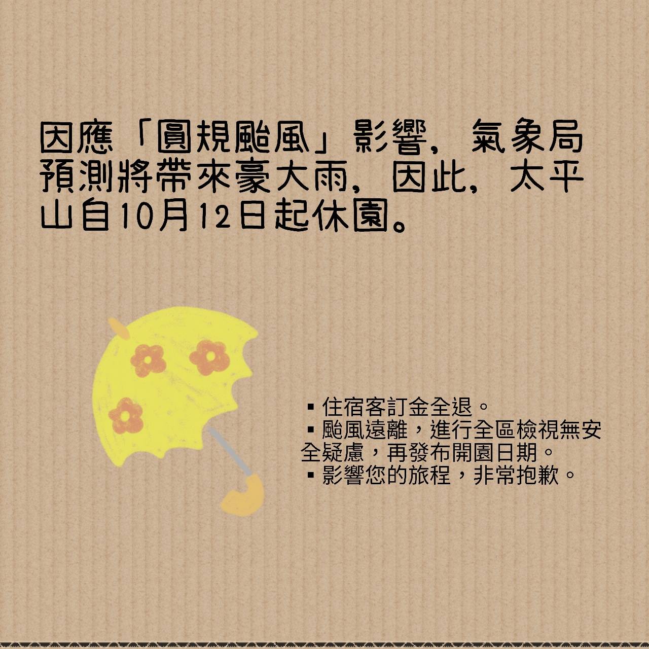 中央氣象局已於10月10日20時30分發布「圓規颱風」海上颱風警報,為顧及遊客旅遊安全,太平山國家森林遊樂區10月12日(星期二)休園,原預訂住宿遊樂區內之遊客,將全額退還所繳訂金。 依據中央氣象局預測,圓規颱風雖無登陸台灣,但外圍環流將為台灣東部及東北部帶來豪大雨,因此位在台灣東北部山區的太平山國家森林遊樂區預測將有明顯雨勢。顧及民眾旅遊安全,10月12日起休園,而開園日期須待颱風遠離,全區檢視無安全疑慮後,再另外發布訊息。 林務局羅東林區管理處提醒民眾隨時注意颱風資訊,為了您的安全,近日請勿前往山區進行遊憩活動。 相關太平山封閉及開放訊息可於下列網站查詢: ▪️台灣山林悠遊網 http://recreation.forest.gov.tw ▪️羅東林區管理處網 http://luodong.forest.gov.tw/ ▪️太平山官網 http://tps.forest.gov.tw ▪️太平山FB粉絲團 http://www.facebook.com/tps100.forest/