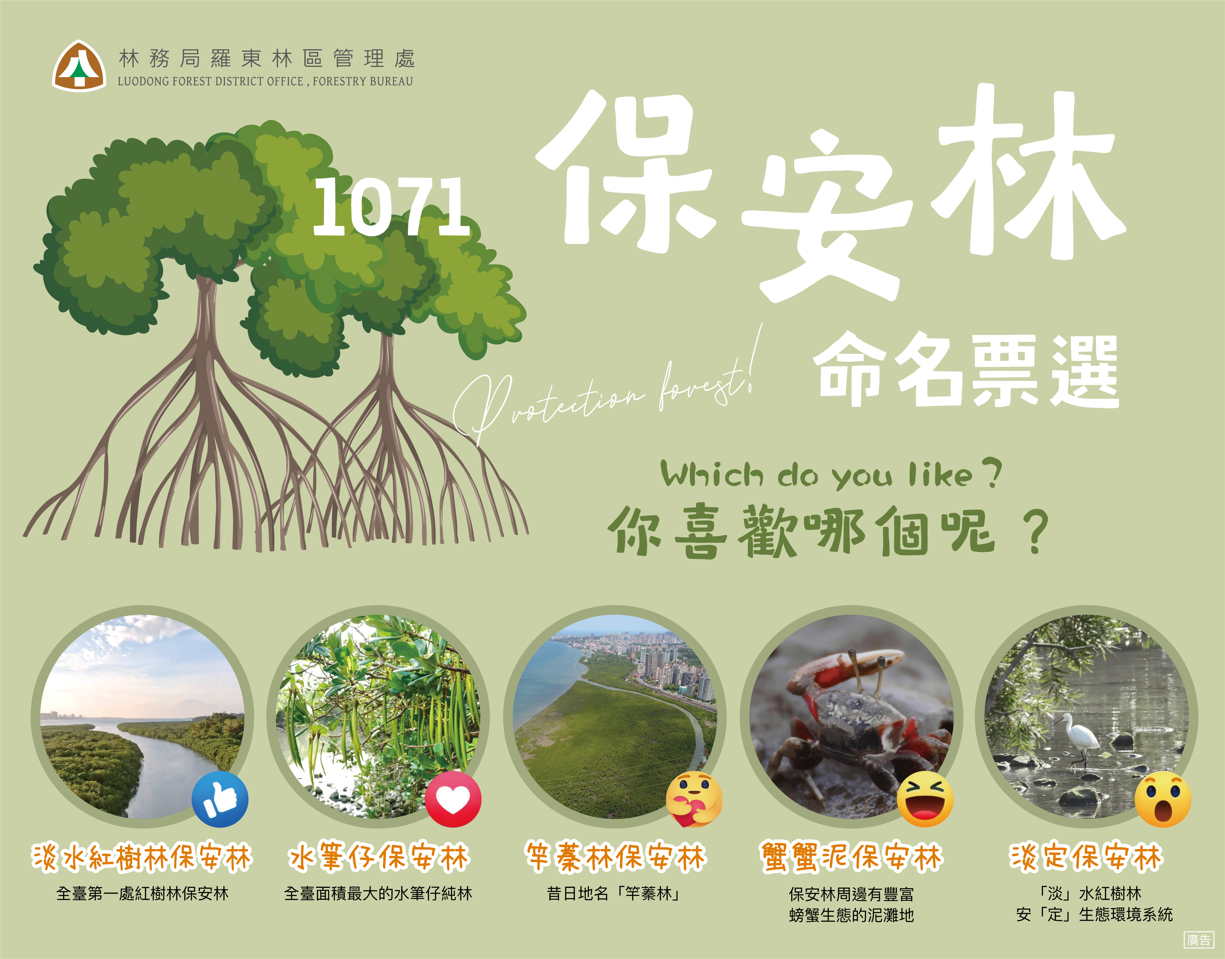 林務局羅東林區管理處辦理編號第1071號自然保育保安林命名票選活動,即日起到14日(星期一)中午12點截止,至「太平山國家森林遊樂區」臉書粉絲專頁本則貼文下方選擇喜歡的名稱,點選相對應的表情符號。投下神聖一票的你/妳,就有機會抽中「保安精靈-羅東阿鷲」大抱枕(尺寸約50 X 70公分),名額10名(詳情請上臉書粉絲專頁查詢https://www.facebook.com/tps100.forest/)。 1071保安林位於新北市淡水區內,民國73年編入為保安林,面積約80公頃,緊鄰淡水河河口,也是依文化資產保存法公告的淡水河紅樹林自然保留區範圍,是全臺第一處紅樹林保安林也是全臺面積最大的水筆仔純林。羅東林管處表示,本次是邀請本處的紅樹林生態教育館解說導覽志工發想,從中挑選出 5個具意義又具代表性的候選名字,分別是淡水紅樹林保安林、水筆仔保安林、竿蓁林保安林、蟹蟹泥保安林、淡定保安林,邀請大家來為默默守護家園的這片保安林命名。 羅東林管處進一步表示,1071這個看似神祕的數字其實是保安林的編號,如同每個人的身分證字號,編碼前2碼代表的是所在地縣市,例如:30代表台北市、10代表新北市、27代表宜蘭縣,後2則是保安林編入時間的先後順序,以後大家在戶外看到保安林解說牌,不妨親自為保安林解密唷!