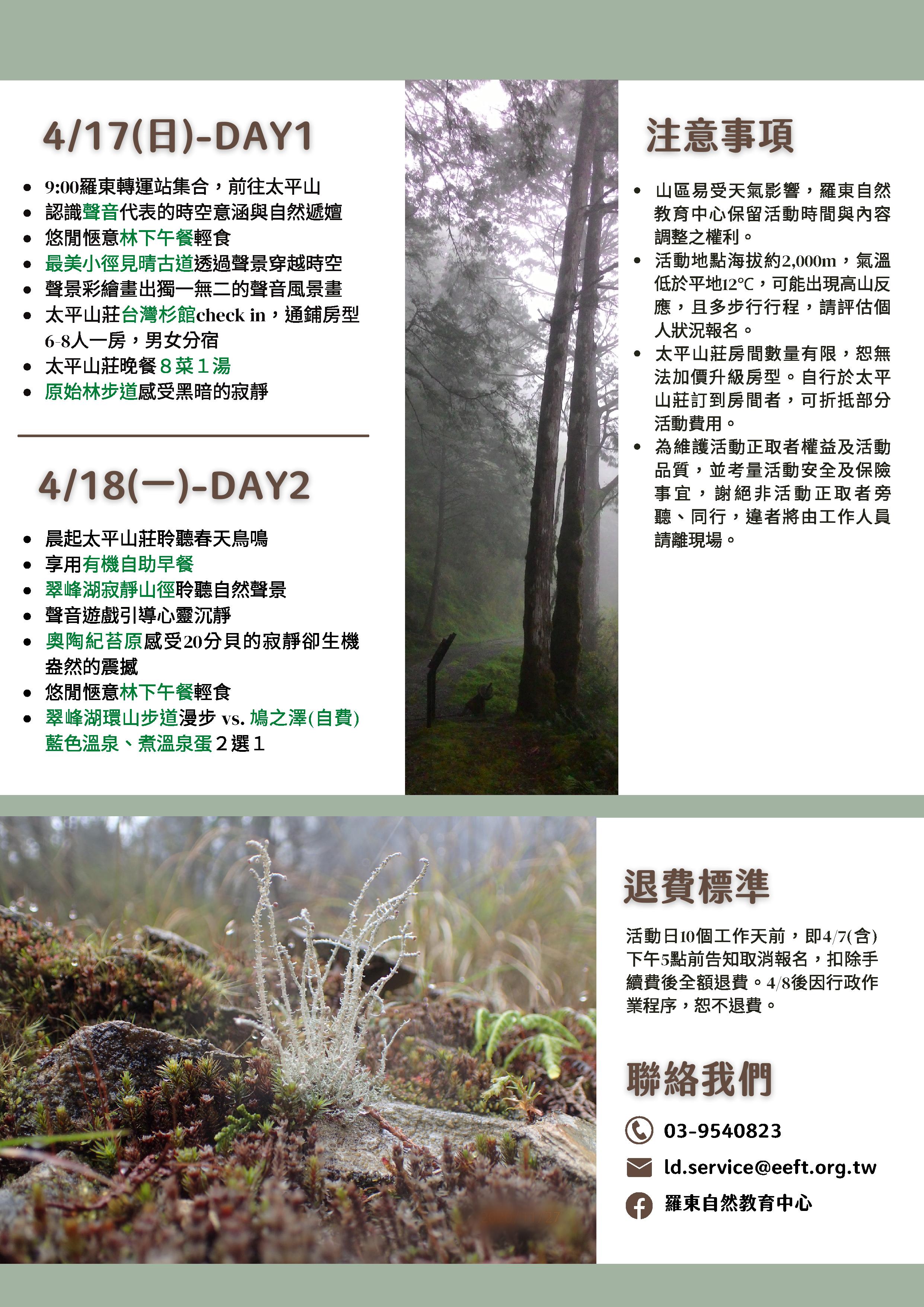 林務局羅東林區管理處所轄太平山國家森林遊樂區,擁有壯闊的雲海與神祕的霧林森林生態,是許多人喜愛前往的旅遊景點,然而太平山還有一項能為城市人帶來強大的紓壓感,卻少有人知的神秘力量,那就是「寂靜的力量」。羅東自然教育中心將於4月17~18日兩天於太平山國家森林遊樂區辦理「玩聲音聽世界」森林療育活動,帶領大家用聽覺玩森林,感受自然聲音擁有的療癒力,將踏入世界最美小徑見晴懷古步道與全臺第一條「寂靜山徑」-翠峰湖環山步道,感受極度沉靜卻生機盎然的震撼,夜晚住宿太平山莊,十分適合生活忙碌又緊張的現代人,給自己兩天的時間好好放鬆一下。 「寂靜」並非絕對無聲,而是遠離一切人造音,只用耳朵專注接收自然聲音的狀態,太平山的翠峰湖環山步道2K+200M~3K+600M區段,即是國內首條通過認證的「寂靜山徑」,由於地面到樹梢都佈滿軟綿嫩綠的泥炭苔,在沒有人為干擾的情況下,最低音量僅有20分貝。「玩聲音聽世界」將透過聲音小遊戲為引導,讓您的心靜下來、慢下來,開啟感官新體驗,練習聽出聲音中的風景,靜聽涓滴細水滑落石壁,感受柔軟蘚苔地毯,透過聆聽讓心靈更接近山林、回歸自然。 歡迎年滿16歲以上熱愛大自然的您、想紓壓的您、對森林療育有興趣的您,想用不一樣的方法體會自然的您,一同來感受太平山森林的寂靜力量,走進森林、放鬆身心。即日起於臺灣山林悠遊網(https://recreation.forest.gov.tw/Education/Course?id=LD-TA1101)開放線上報名,每人費用5300元(含門票、接駁車、太平山莊住宿、餐食、保險等費用),名額有限,額滿為止。詳細活動訊息請密切關注羅東自然教育中心官方臉書粉絲頁。