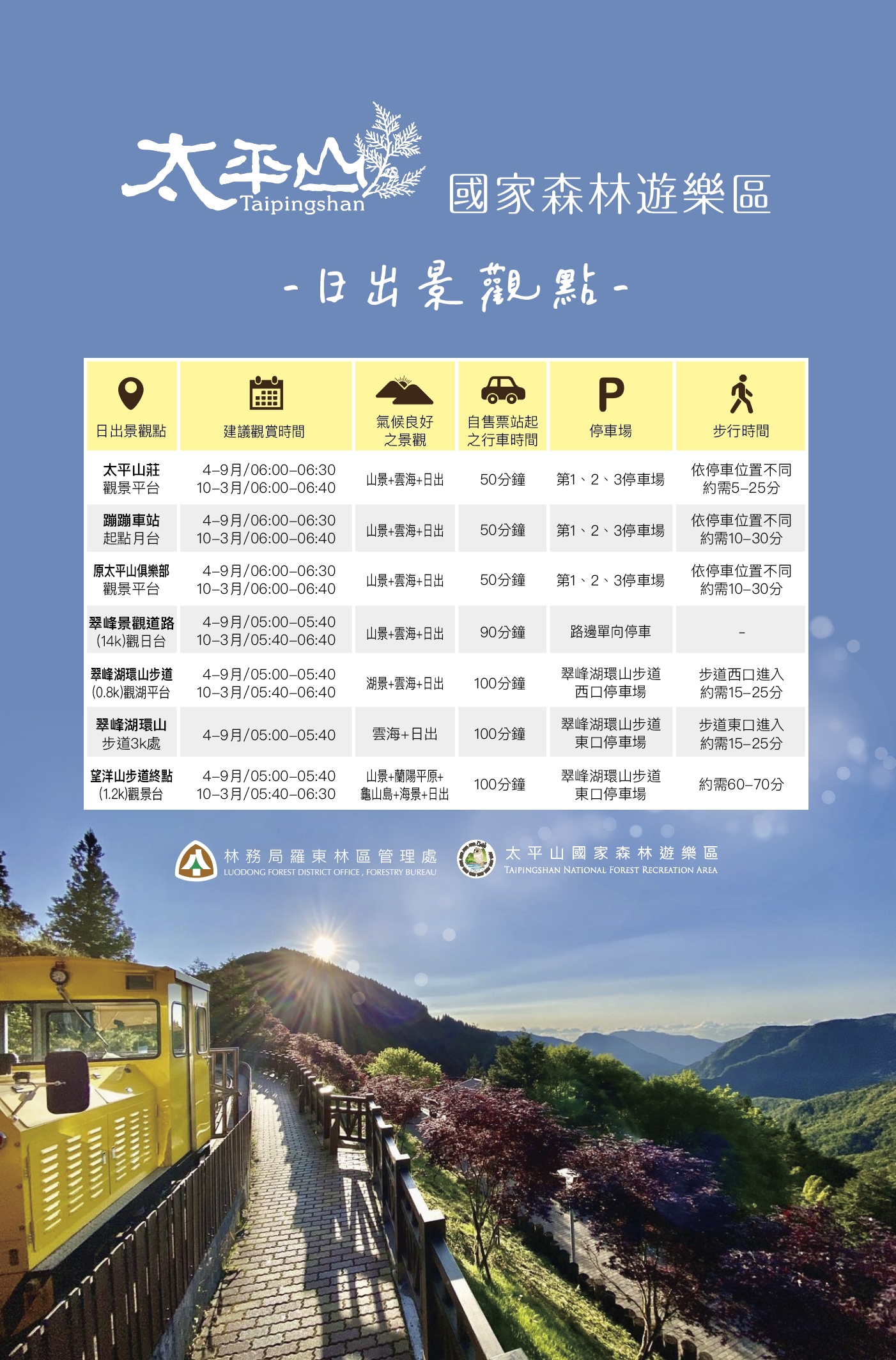海拔介於365-2,000公尺的太平山國家森林遊樂區,一直是北台灣賞日出的絕佳地點之一。林務局羅東林區管理處指出,太平山國家森林遊樂區2023年元旦日出時間約於清晨6:30-6:50,為了讓民眾能迎接2023年第一道曙光,當天園區提早於清晨3:00開園,入園遊客每人均可獲贈一張2023新年紀念編號書籤,第一位入園遊客除了可以拿到NO.0001的書籤外,更可獲得太平山福袋一份。 元旦當日若氣候良好,羅東林區管理處推薦在太平山欣賞日出的景點有7處:(1)太平山莊觀景台、(2)蹦蹦車車站月台、(3)原太平山俱樂部廣場欣賞「三星山日出」、(4)翠峰景觀道路14k觀景台觀賞「雲海日出」、(5) 翠峰湖環山步道0.8K觀景平台欣賞湖景日出、(6)翠峰湖環山步道3K處觀賞「雲海日出」、(7)望洋山步道觀景台觀賞「龜山朝日」。 太平山熱門觀賞日出景點之一的翠峰湖區,羅東林區管理處考量翠峰景觀道路路幅較小,為維持交通順暢,翠峰景觀道路元旦當日上午3:00-9:00間將實施「時段單向通行」交通管制措施,去程(太平山往翠峰湖)6:30後禁止車輛進入,返程(翠峰湖往太平山)於08:00前禁止通行,直至9:00後正常開放。請遊客配合執勤員警指揮及引導,以確保行車安全。元旦當日區內各據點販賣部及雲海咖啡館也因應提早至7:00營業,可選購太平山限定紀念品。 詳情可查詢太平山FB粉絲團(http://www.facebook.com/tps100.forest/)、台灣山林悠遊網(http://recreation.forest.gov.tw/)及太平山森林遊樂區專網(http://tps.forest.gov.tw/)發布,或電洽太平山服務專線(03-9809805)及售票站(03-9809619)詢問。