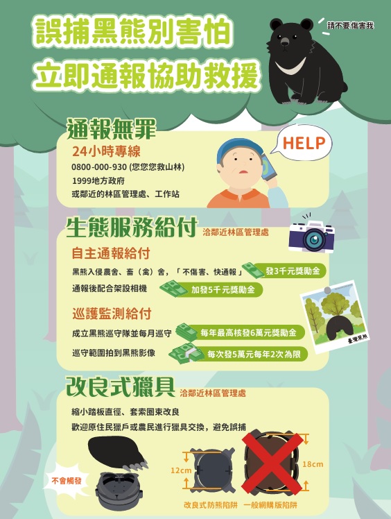 林務局羅東林區管理處昨日邀請宜蘭縣消防局第二大隊南澳分隊、租地林農及在地部落居民共聚於南澳工作站共同參與一年一度的防火座談會外,並藉此機會向關心山林資源永續發展的民眾宣導「臺灣黑熊生態服務給付示範計畫」,以給付「生態薪水」的方式緩和人與黑熊間的衝突,降低民眾對黑熊的恐懼,並傳遞正確的黑熊保育觀念。 臺灣黑熊主要活動區域為中央山脈區域,故宜蘭縣南澳鄉及大同鄉為林務局羅東林區管理處推動「臺灣黑熊生態服務給付示範計畫」核心區域。黑熊生態給付計畫包含「自主通報給付」及「巡護監測給付」兩個部分,「自主通報給付」即民眾若發現黑熊入侵農地或住家,可通報領獎勵金新臺幣3,000元,通報後配合架設相機,再加發獎勵金新臺幣5,000元;「巡護監測給付」部分則是社區部落成立黑熊巡守隊並每月巡守,每年最高核發6萬元獎勵金,若於巡守範圍拍到黑熊影像,每次最高核發五萬元獎勵金(每年兩次最高為限)。盼透過「臺灣黑熊生態服務給付示範計畫」的推動,扭轉民眾對於黑熊侵擾村落、家畜、農物作造成損失的負面印象,降低民眾對黑熊的恐懼。 有鑑於過去臺灣黑熊曾發生因誤觸陷阱,獵人發現後擔心遭到法辦而使黑熊不幸遇害的案例,為宣導人與熊之間的正確互動觀念,提醒民眾若在山林遇到黑熊時應遵守3不2要的原則,即不干擾、不餵食、不拍照打卡;要即時通報、保持距離。另外,為避免臺灣黑熊誤觸陷阱,亦向在地部落民眾宣導可持舊式山豬吊等狩獵陷阱至南澳工作站或羅東林管處洽詢,免費更換改良式獵具,避免誤捕黑熊。另外,呼籲民眾若發現臺灣黑熊等瀕危保育類野生動物誤觸陷阱或誤捕,請撥打0800-000-930(您您您-救山林)或1999,讓專業團隊前往協助救援,盼全民共同守護珍貴的臺灣黑熊。