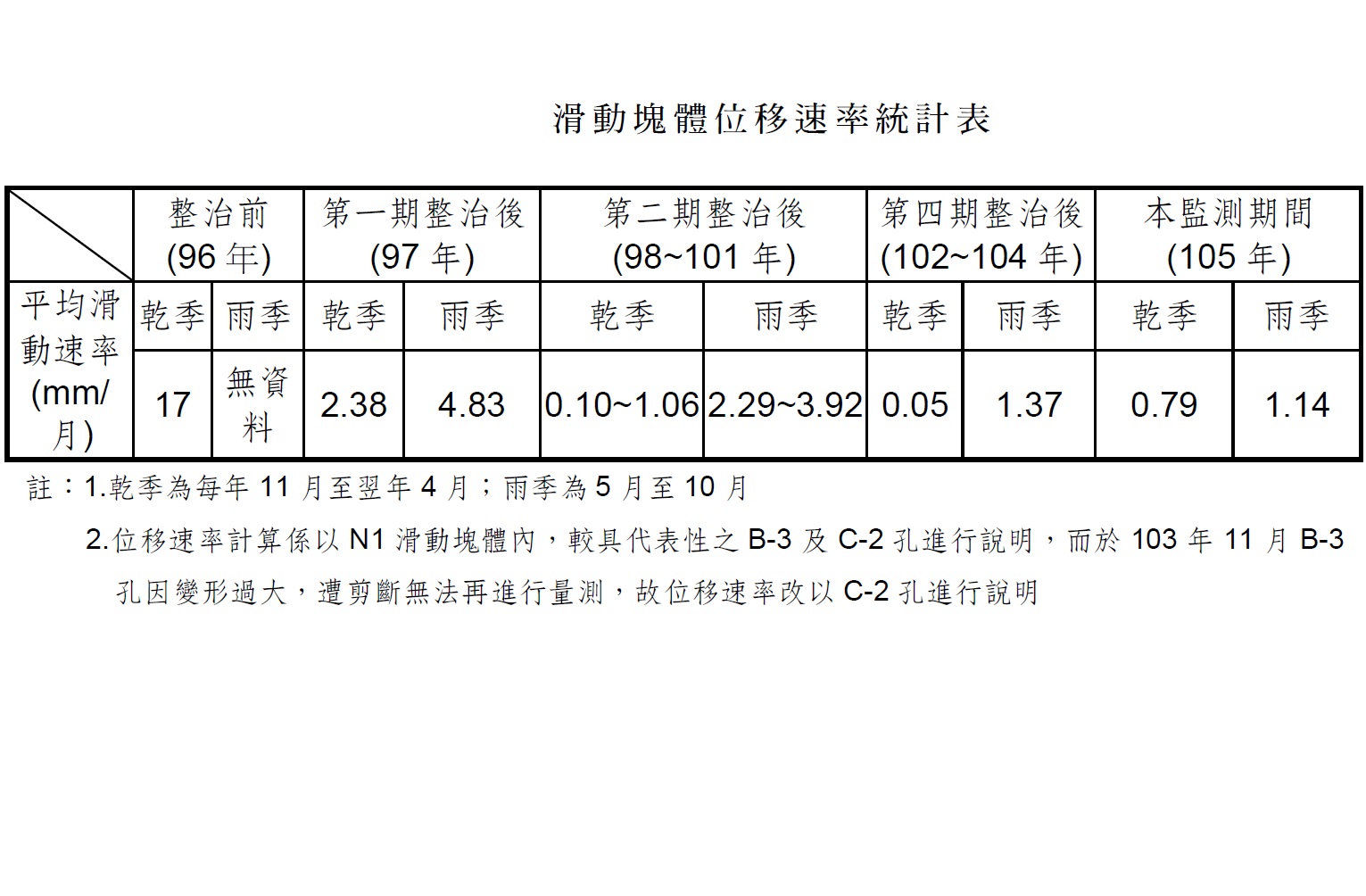 該地區於94年間分別遭受海棠、龍王及泰利颱風侵台影響,造成山坡地面積約6公頃的大規模滑動災害,同時也造成太平山國家森林遊樂區聯外道路中斷長達1年的時間。 為使該處地滑狀況能夠被有效控制,旋即於95年度起辦理該處山坡地地滑監測調查工作,並根據調查結果,判斷災害發生原因,同時針對病兆研提有效治理方案。本區域經歷多年治理,整體坡面滑動速率已由整治前的17mm/月,達到常時的穩定狀態,惟於雨季期間仍有1.14mm/月的位移量,本分署將持續關注此現象。 目前對於該坡面仍持續進行監測工作,以確保往來太平山國家森林遊樂區的人車安全。 中間地滑監測案-中間地滑區位置圖 中間地滑監測案-中間滑動塊體分布圖