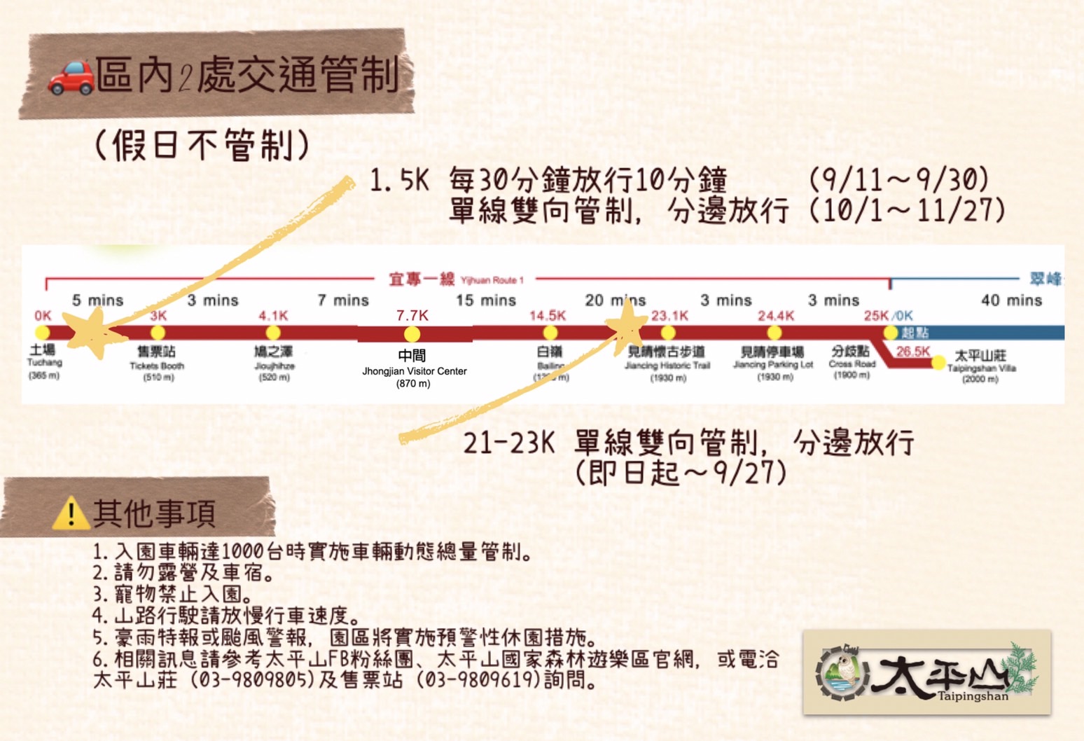 太平山國家森林遊樂區為了確保用路人的安全,將於暑假結束後,於宜專一線公路1.5k路段進行邊坡復育工程,因此需要進行交通管制。管制日期為9月11日至11月27日期間的平日(假日不管制)。
