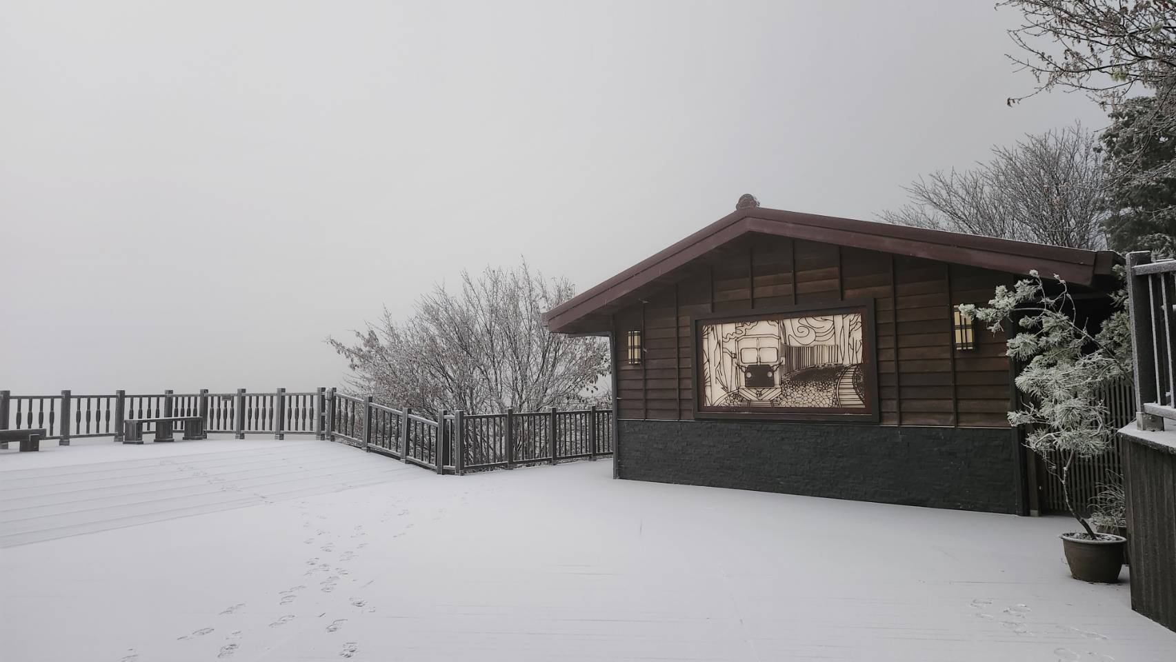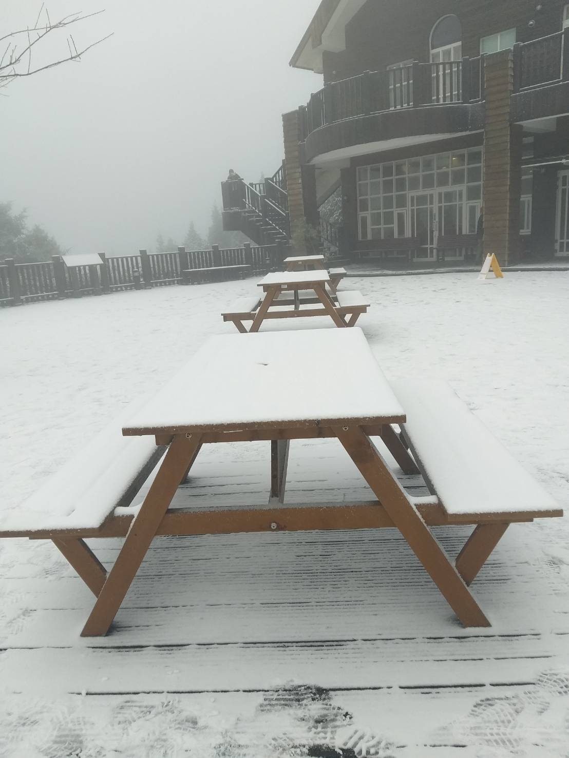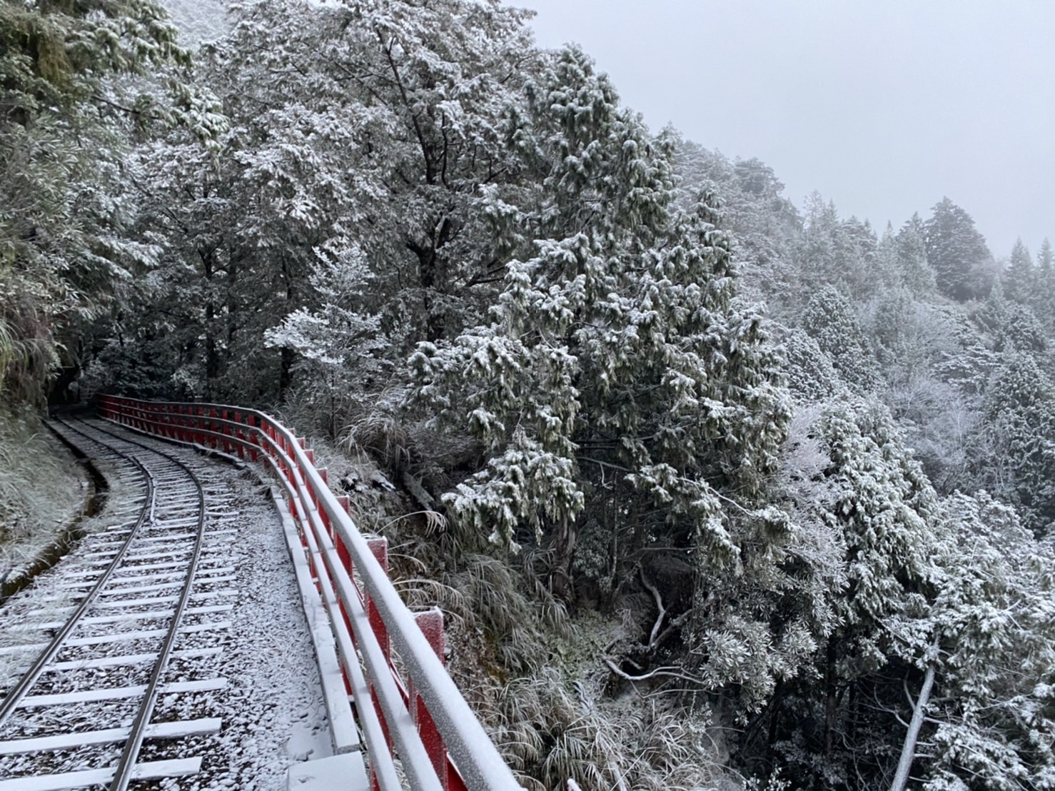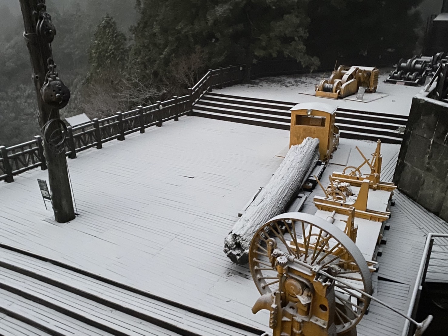 今日是冬至,前一夜11點多,氣溫已降到攝氏零下6度,加上水氣充足,太平山下了今年冬季的第一場雪,主要下在太平山莊及翠峰湖區,海拔介於1,840-2,000公尺間,斷斷續續下到凌晨約2點左右。上午七時許,太平山溫度-1度,雪暫停,厚度約1公分,但部份區域,偶爾下冰霰。