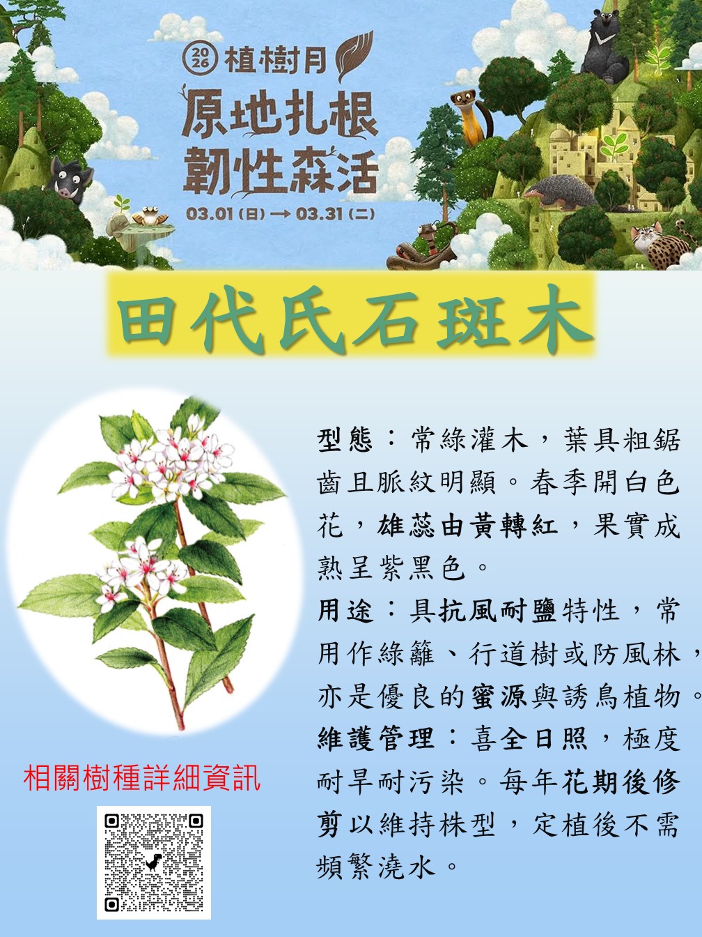 三月是植樹月,林業及自然保育署宜蘭分署邀請民眾響應115年植樹月「原地扎根 韌性森活」主題活動,推廣臺灣原生植物,今(115)年宜蘭分署將於3月5日啟動轄內各地區植樹及贈苗系列活動,預計有23場次,推廣發送烏來杜鵑、田代氏石斑木、桃金孃、山黃梔、金毛杜鵑、細葉山茶、竹子山十大功勞等多種樹苗,總計1萬餘株臺灣原生樹種苗木,歡迎民眾踴躍參與,一同建構國土生態綠色網絡,營造臺灣生態廊道,亦讓都市一起綠美化。 歡迎有興趣兌領苗木的鄉親朋友,憑115年3張發票(雲端發票亦可)換取臺灣原生樹苗1株,並請自備環保袋,所募集的愛心發票將於植樹月結束後,由林業保育署宜蘭分署統一捐贈予宜蘭縣社會福利聯合勸募基金會,以協助當地社福事業發展,歡迎鄉親共襄盛舉,植樹減碳愛地球,同時發揮愛心做公益。 林業保育署宜蘭分署提醒您,各場次贈苗活動苗木索取方式不同,請民眾就近領取苗木時,參考各場次須知事項。活動詳情請參閱「植樹月贈苗活動一覽表」(https://url.forest.gov.tw/115tree)(如有異動會以紅字標示,提醒您出發前務必再次確認資訊)或至林業及自然保育署宜蘭分署臉書專頁查詢。