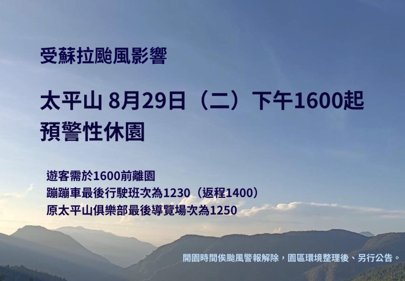 依據中央氣象局發布颱風蘇拉恐影響台灣氣候,林業及自然保育署宜蘭分署考量太平山國家森林遊樂區位處遍遠山區,聯外道路台七線、台七甲線、宜51線等,逢豪大雨恐有封閉、中斷之疑慮,顧及旅遊安全,因此園區訂於8月29日(星期二)下午16:00起預警性休園,區內8條自然步道:鳩之澤自然步道、見晴懷古步道、檜木原始林步道、鐵杉林自然步道、茂興懷舊步道、翠峰湖環山步道、望洋山步道、台灣山毛櫸步道同步封閉 ,遊客須於16:00前離園,當日不提供住宿,蹦蹦車最後行駛班次為12:30(返程14:00),原太平山俱樂部最後導覽場次12:50。 參考氣象局預估影響天數後,初步預計休園至9月1日(星期五),惟實際恢復開園日期,將視颱風警報解除後,園方進行災害勘查及環境整備,做滾動式調整。林業及自然保育署宜蘭分署請民眾隨時關注太平山官網,也提醒民眾颱風期間,減少戶外活動,請勿前往山區步道,以維安全。 ⛰️太平山官網: https://tps.forest.gov.tw/TPSWeb/wSite/mp 台灣山林悠遊網: https://recreation.forest.gov.tw/ 📱太平山官方FB粉專: https://www.facebook.com/tps100.forest?mibextid=ZbWKwL 📱太平山售票站:03-9809619