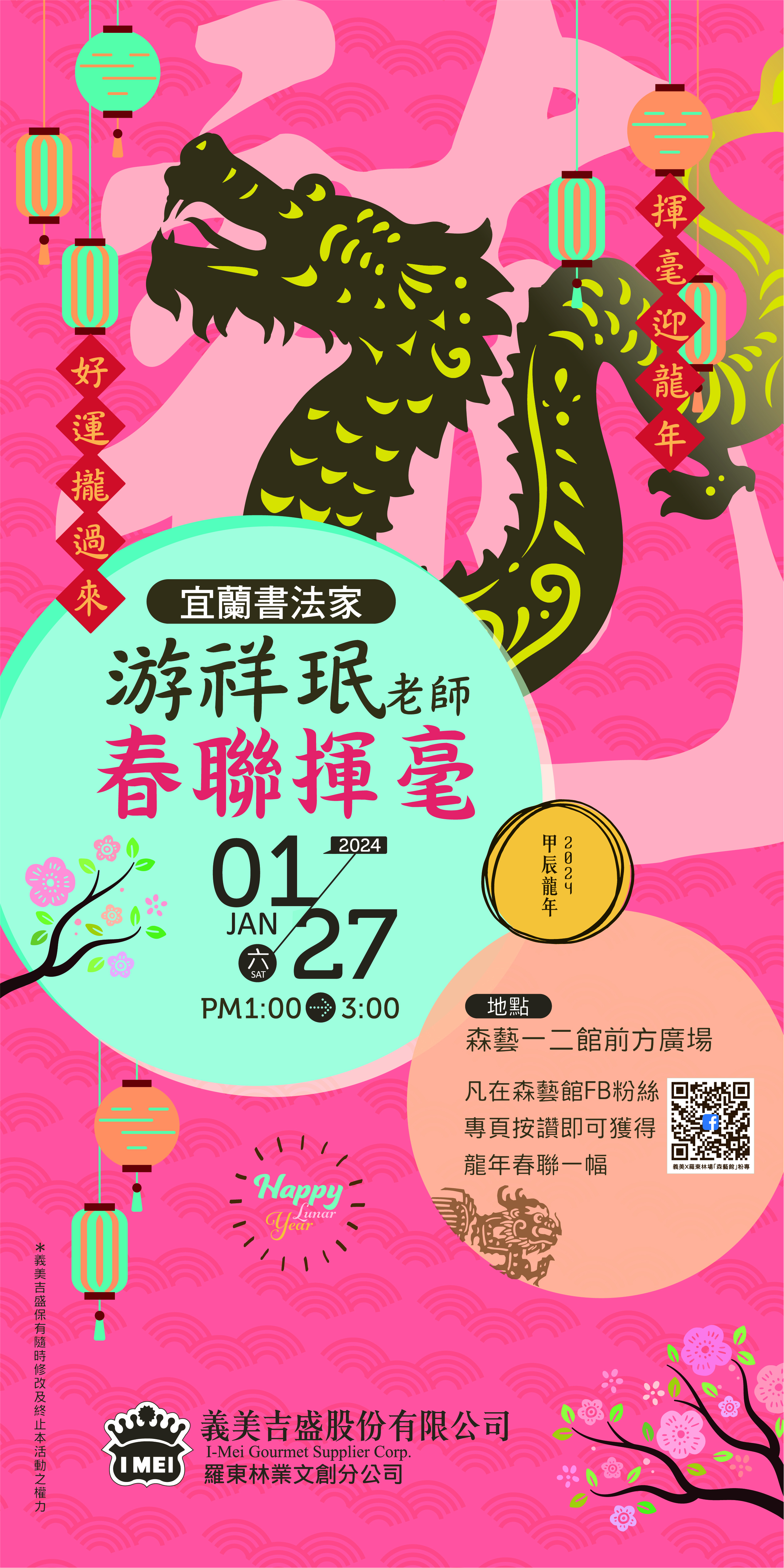 位於羅東林業文化園區的「森藝館」由義美吉盛公司經營,販賣輕食餐點、食品及木藝文創伴手禮;農曆年前義美吉盛特別舉辦「揮毫迎龍年創意春聯」活動,邀請宜蘭在地書法家游祥珉老師於1月27日(六)下午來到園區內大筆揮毫,歡迎大朋友小朋友,一起到森藝館前感受濃濃年味,帶著龍年吉祥祝福回家。