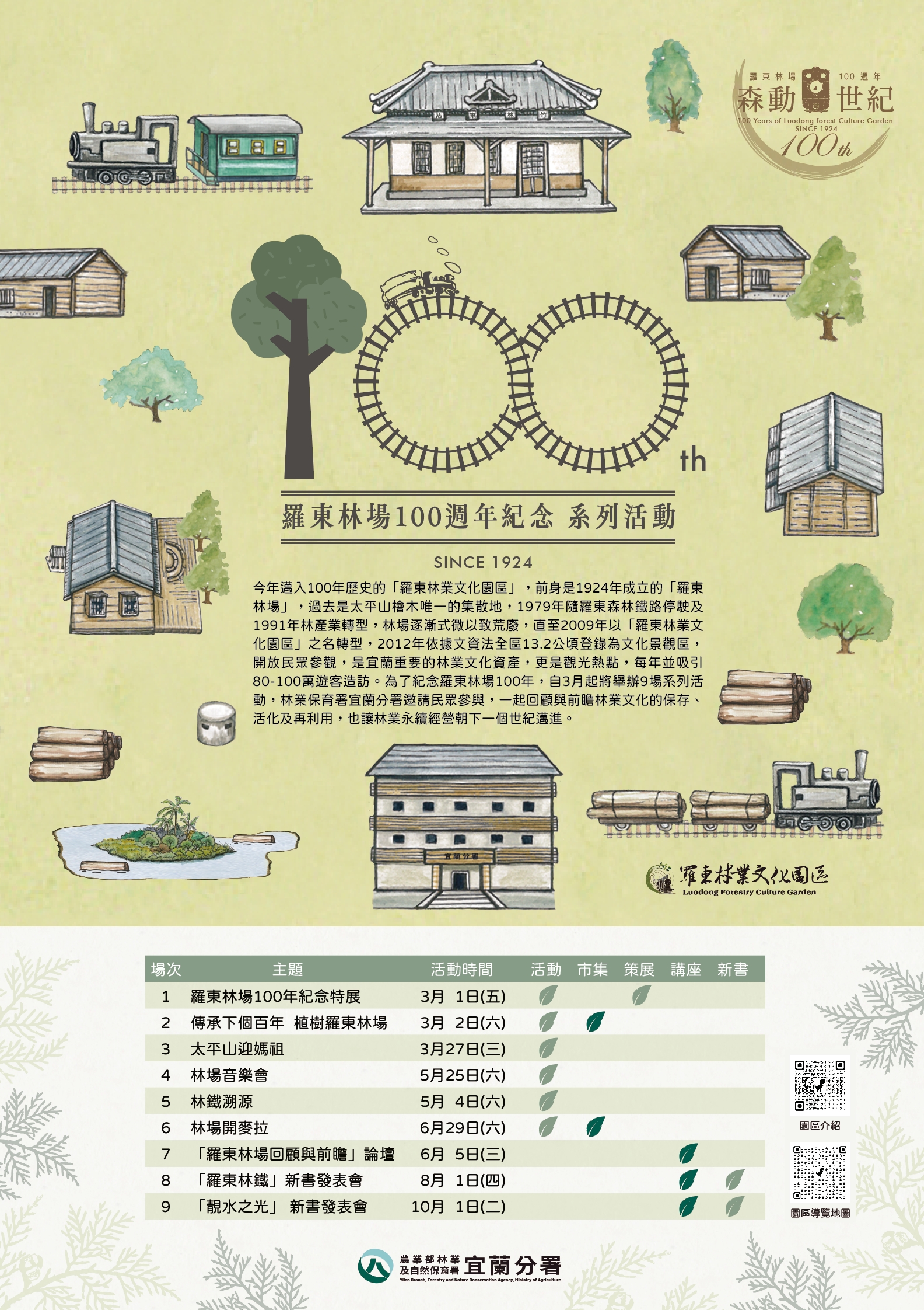 今年邁入100年歷史的「羅東林業文化園區」,前身是1924年成立的「羅東林場」,過去是太平山檜木唯一的集散地,1979年隨羅東森林鐵路停駛及1991年林產業轉型,林場逐漸式微以致荒廢,直至2009年以「羅東林業文化園區」之名轉型,2012年依據文資法全區13.2公頃登錄為文化景觀區,開放民眾參觀,是宜蘭重要的林業文化資產,更是觀光熱點,每年並吸引80-100萬遊客造訪。林業保育署宜蘭分署為了紀念羅東林場100年,自3月起將舉辦9場系列活動:「羅東林場100年紀念特展」、「傳承下個百年·植樹羅東林場」、「太平山迎媽祖小旅行」、「林場音樂會」、「林鐵溯源」、「林場開麥拉」、「羅東林場回顧與前瞻論壇」、「羅東林鐵新書發表會」、「靚水之光新書發表會」,宜蘭分署邀請民眾可以參與活動、市集、論壇、新書發表會,一起回顧與前瞻林業文化的保存、活化及再利用,也讓林業永續經營朝下一個世紀邁進。 宜蘭的林業發展始於日本人在1914開始進入太平山,經過一年的森林調查後於1915年進行檜木的伐採,初期以管流運材方式藉由蘭陽溪豐沛的溪水將才材運至員山,直至1921年起興建並收購糖廠鐵道作為太平山森林運材鐵道,鐵道總長36.95公里,自土場站起行經天送埤、歪仔歪至羅東的竹林車站,於1924年正式通車,「羅東林場」因此取代員山貯木場成為木材集散地,太平山當時與阿里山、八仙山林場並列為日治時期三大林場,開採規模為三大林場之首,帶動羅東的繁榮。今(2024)年時值羅東林場100年(1924-2024),因此林業保育署宜蘭分署特別規劃全年度一系列的活動,希望邀請民眾一起回顧百年承先啟後,以不同的方式看見羅東林場,進而讓更多人認識臺灣林業的文史轉變及與時俱進。 宜蘭分署為了紀念羅東林場100週年,規劃了9場系列活動,首場的「羅東林場100年紀念特展」訂於3月1日(星期五)上午10點30分於羅東林業文化園區的森動館開展,並舉行紀念活動的啟動儀式;接續配合每年植樹月,將在3月2日(星期六)舉辦「傳承下個百年·植樹羅東林場」大型活動;每年太平山都會舉行迎媽祖文化祭典,加上鎮安宮2021年已登錄為歷史建築,民眾引頸期盼可以參與盛典,因此今年首次舉辦「太平山迎媽祖小旅行」,開放限額民眾報名於3月27日(星期三)參加;為了以不同的森情樣貌展現林業,將會舉辦以太平山及羅東林場為題入譜的「林場音樂會」;林場內的羅東自然教育中心更將推出以往經典且高人氣的「林鐵溯源」及「林場開麥拉」主題活動;為了紀錄林業的蛻變而舉辦產官學界的「羅東林場回顧與前瞻論壇」;羅東林場重要的文化資產元素之一-森林鐵路,也會有「羅東林鐵新書發表會」;林業的推展從過去的林木生產到現今森林永續經營更擴及自然保育的價值觀念,因此為了讓民眾更了解蘭陽平原這片土地自然史,加碼舉辦「靚水之光新書發表會」。 羅東林場100週年系列活動於3月啟動,期程至10月,宜蘭分署歡迎有興趣參加活動的民眾可上網查詢詳情(宜蘭分署:https://yilan.forest.gov.tw/;羅東林業文化園區:https://recreation.forest.gov.tw/Forestry/CP?typ_id=0100021)。