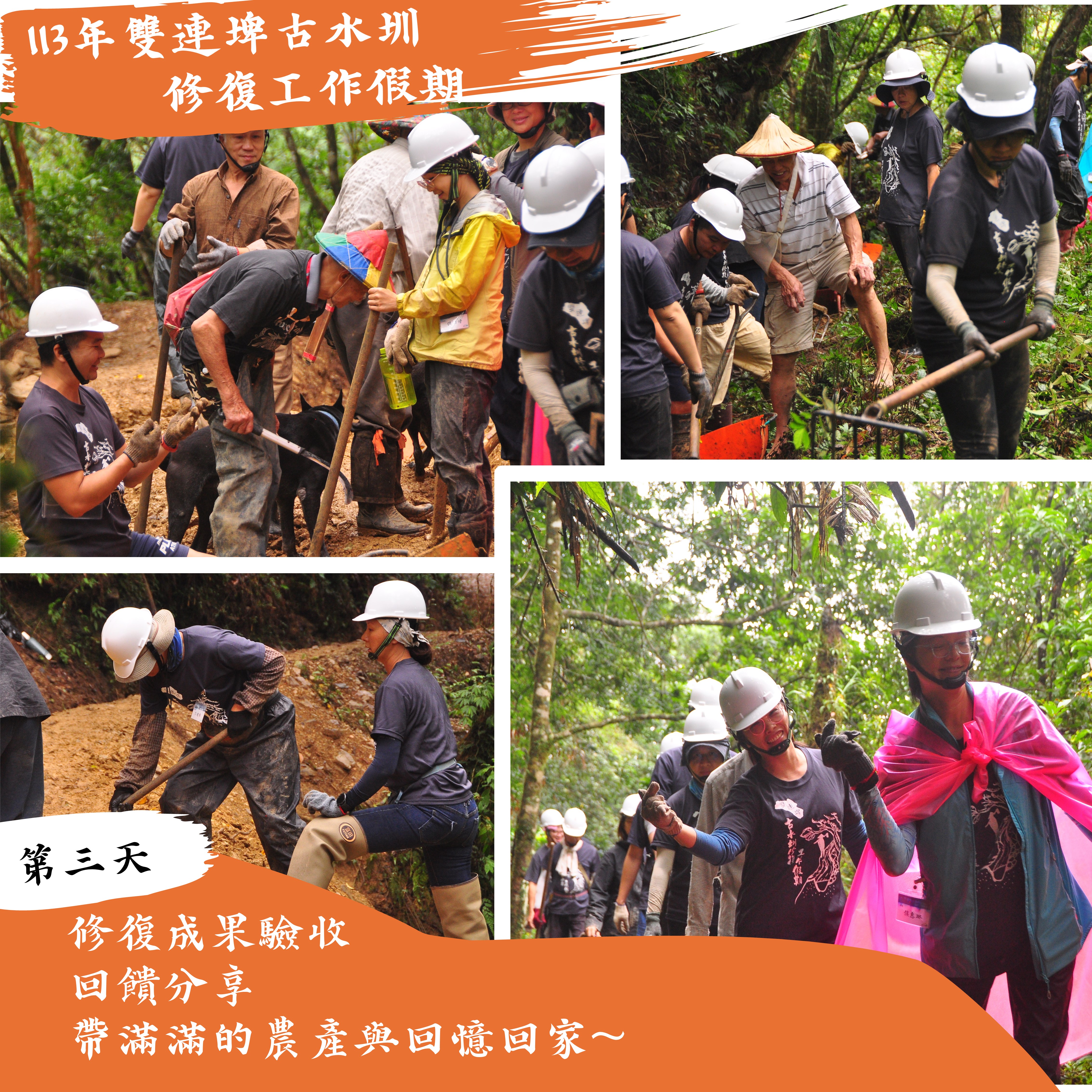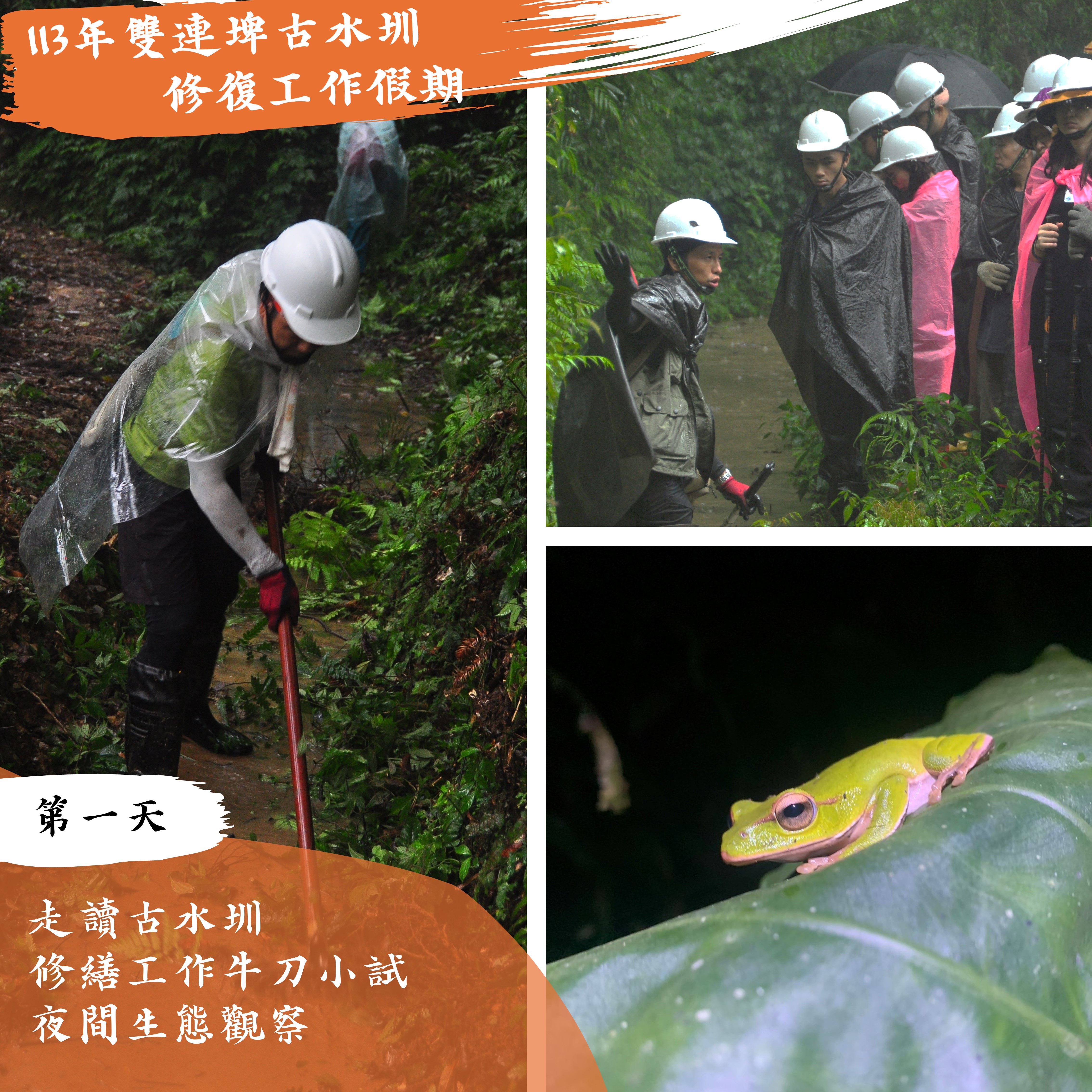 雙連埤同時為野生動物保護區、國家級重要濕地、蘭陽溪上游水源以及百年山村,是生態豐富且人文薈萃的寶地。此中有條百年古水圳,過去灌溉了村落連綿的水稻田,維繫雙連埤人世代的命脈。雖中斷約30年,近年來為促進雙連埤的友善農耕,林業及自然保育署宜蘭分署結合人禾環境倫理發展基金會、宜蘭縣雙連埤地區永續發展協會,以工作假期、在地點工的方式,持續進行古水圳的修復工作。 由終點向源頭持續邁進 古水圳長約六公里,橫跨了四個山頭水系,為先民們一鋤一鏟環山挖掘而成。古水圳引粗坑溪上游的水進入山村,灌溉了連綿的水稻田,並維繫了雙連埤人世代的命脈。過去為了維持水圳的運作,山村的居民每年農曆十月開始動起來,以「出公工」的方式——集眾人之力,完眾人之事——進行水圳的修繕。修築及修繕的過程,也留下許多就地取材、適地適用的工法與智慧,這些技法除了是雙連埤耆老們的共同記憶外,也是全民重要的文化資產。 本年度(113年)將辦理3梯次古水圳修復工作假期,第1梯次:113年5月18日至20日、第2梯次:113年9月28日到30日、第3梯次:113年10月28日到30日,活動時間皆為週六到週一(三天兩夜),在雙連埤古水圳修復工作假期中,會由在地師傅帶你走讀古水圳的人文歷史與生態環境,學習毀損的圳段因應地形、植披、土質的差異而運用的不同修繕工法,並且手把手帶你進行古水圳的修復。邀請你一起在雲霧繚繞的柳杉林中,跟著在地師傅的動作,一鋤一鏟修復古圳,找回生命之水!