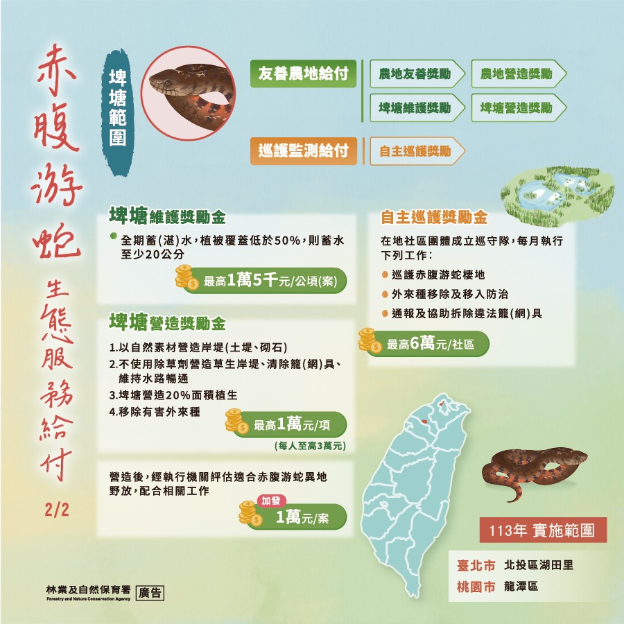 分布於北海岸淺山地區的赤腹游蛇,被列為臺灣第一級瀕臨絕種野生動物。隨著近年極端氣候及人為開發壓力影響,適存棲地大幅銳減,臺北竹子湖地區為現存已知族群之一且規模顯著下降中,因此搶救瀕危物種赤腹游蛇刻不容緩! 赤腹游蛇已於113年4月2日被公告為臺灣第一級瀕臨絕種野生動物,林業及自然保育署宜蘭分署於竹子湖地區展開赤腹游蛇生態服務給付示範計畫,並訂於113年4月29日(一)晚上7點,於湖田里區民活動中心(台北市北投區竹子湖路57-7號),召開「赤腹游蛇生態服務給付說明會」,只要是臺北市湖田里地區的農田地主及農民,無需報名即可參加。「赤腹游蛇生態服務給付示範計畫」包含「友善農地給付」及「巡護監測給付」兩大區塊。「友善農地給付」包含農地友善獎勵、農地營造獎勵、埤塘維護獎勵及埤塘營造獎勵共4項。其中,農地友善獎勵:同時符合維持蓄(湛)水、不使用除草劑或中等毒性以上具水生物毒性農藥、皂素類防治資材等條件,每年最高核發3萬元/公頃(案)為限。農地營造獎勵:符合以自然素材營造田埂、生態池、生態溝、不使用大型農車機具耕犁、移除有害外來種、取得綠保標章等條件,每人每年至高核發3萬元/年。「巡護監測給付」由在地社區團體成立赤腹游蛇巡守隊,並每月巡守執勤,每年最高核發6萬元獎勵金。 林業保育署宜蘭分署表示,赤腹游蛇生態服務給付示範計畫旨在透過生態服務給付提供誘因,鼓勵農民友善耕作以維護與營造其適存棲地面積與品質,並委請財團法人慈心有機農業發展基金會團隊輔導,提供專業技術指導及諮詢,陪伴在地農友投入保育、協助宣導及建立社區巡守隊等工作。與居民產生正向連結,逐步轉變大眾觀感,提升居民保育意識,使赤腹游蛇現有族群止跌回升,同時保全農田濕地其他野生生物,維護生物多樣性,保育行動由你我開始!赤腹游蛇生態給付相關資訊可洽慈心有機農業發展基金會溫小姐(02)7714-6077分機30706。