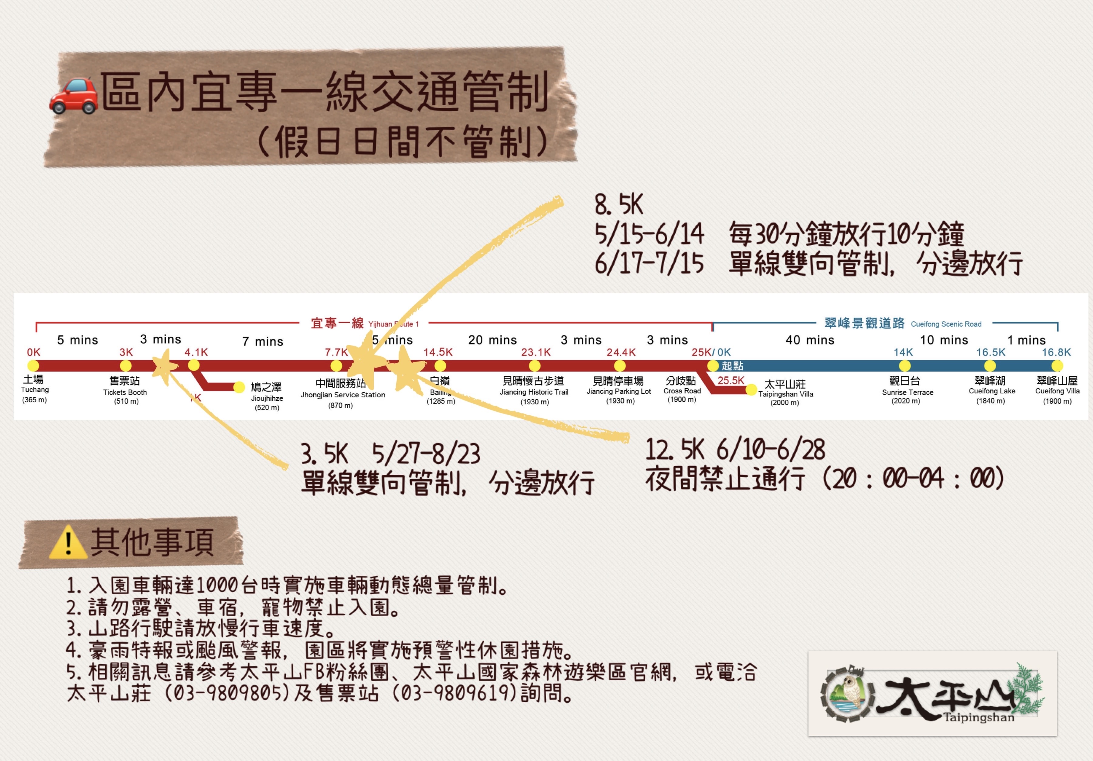 太平山國家森林遊樂區於0403花蓮地震過後,林業保育署宜蘭分署雖已於第一時間進行了搶修及搶通作業,惟經仔細盤點巡查,尚有多處地點須進行安全措施的強化工作,為確保用路人的安全,將於宜專一線公路0-15k路段,進行包括邊坡整治等相關工程,因此需要進行三階段交通管制;管制日期為113年5月15日(三)起至113年8月23日(五)期間的平日(假日不管制)。 管制措施如下: 一、 第一階段於113年5月15日(三)至113年6月14日(五)止,管制地點為宜專一線8.5k(進行邊坡刷坡及材料吊掛作業),管制時間為每日08:00-17:00止,管制方式為每30分鐘開放10分鐘通行、另於113年6月17日(一)至113年7月15日(一)止,管制方式採機動式單線雙向交通管制。 二、 第二階段於113年5月27日(一)至113年8月23日(五)止,管制地點為宜專一線3.5k(進行擋土牆開挖及下邊坡刷坡、材料吊掛作業),管制時間為每日08:00-17:00止,管制方式採機動式單線雙向交通管制。 三、 第三階段於113年6月10日(一)至113年6月28日(五)止,管制地點為宜專一線12.5k(進行夜間預力地錨打設作業),管制時間為每日20:00起至翌日凌晨04:00止,管制方式採全面禁止通行管制。 宜蘭分署提醒遊客管制期間請配合現場工作人員指揮,以維通行安全。
