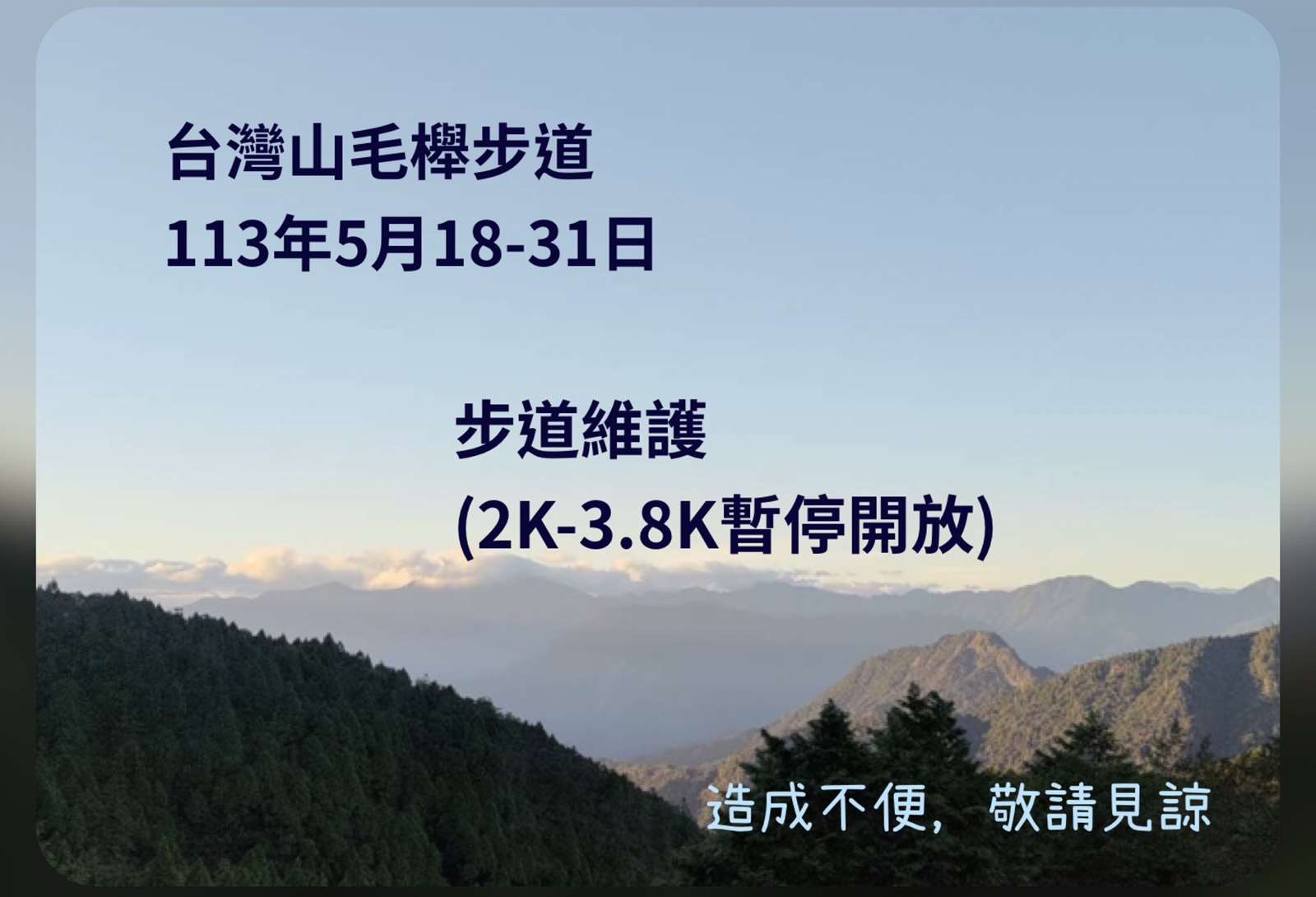 林業及自然保育署宜蘭分署為提供遊客安全舒適的休憩環境、提升遊憩設施安全,自113年5月18日起至31日針對台灣山毛櫸步道進行棧橋整修工程(共計14日),步道局部開放至2K、步道後段(2K-3.8K)暫停開放,請遊客勿進入暫停開放區域,造成不便敬請見諒。 步道開放情形可上台灣山林悠遊網 (http://recreation.forest.gov.tw)及太平山國家森林遊樂區官網(https://tps.forest.gov.tw/TPSWeb/wSite/mp)查詢。