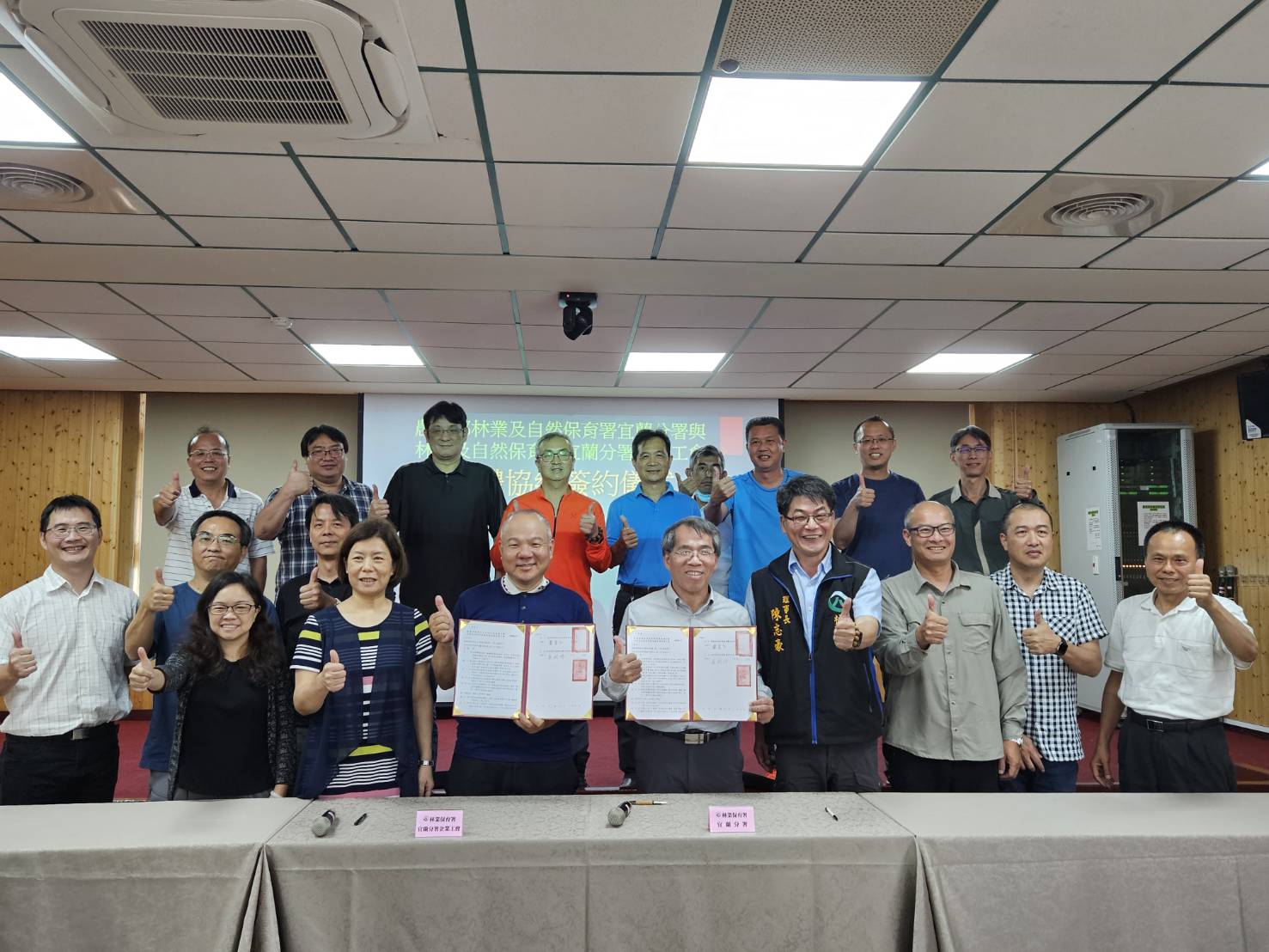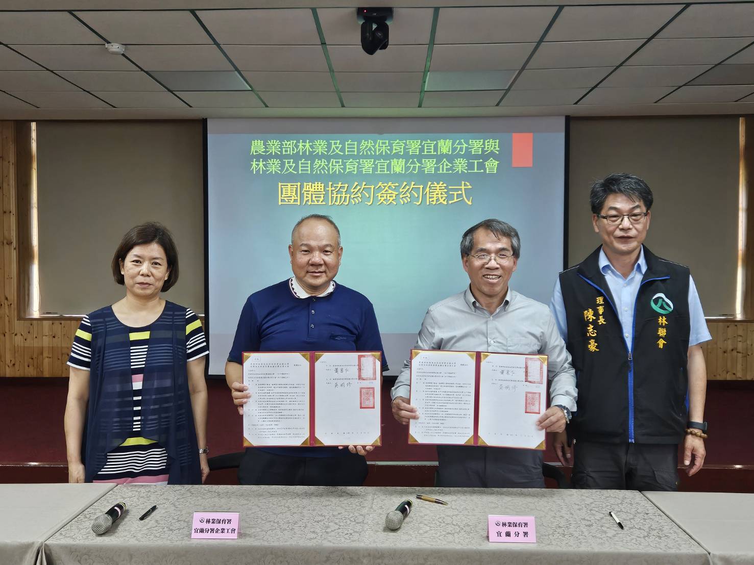 農業部林業及自然保育署宜蘭分署與其宜蘭分署企業工會日前(5月21日)在分署大禮堂,舉行全國首例林業機關,也是宜蘭縣公務機關首例的團體協約簽約,儀式由宜蘭分署分署長蕭崇仁與宜蘭分署企業工會理事長吳明修代表簽署,並邀請宜蘭縣政府代表科長黃秀靜、臺灣省林業產業工會聯合會理事長陳志豪等人共同見證,雙方展現和諧的勞資氛圍,營造健康、安全、友善的職場文化,並促進勞動團結理念奠定林業永續經營的基石。 分署長蕭崇仁表示,協商過程相當不容易,勞資雙方均付出許多心力,達成共識,尤其本次團體協約簽約儀式,既是宜蘭縣公務機關的第一例,也是全國林業機關首例,在於展現勞資高度和諧氛圍有特殊意義,同時讓從事林業與自然保育的員工獲得更周全的權益保障。 林聯會理事長陳志豪,也對於此次完成首例林業團體協約簽署,表示感謝勞資雙方協商團隊的努力及付出,也特別感謝署長林華慶及分署長蕭崇仁與經營團隊的支持,讓林業保育署員工的各項勞動條件,更加優於勞基法,尤其是對於員工健康檢查權益保障的大幅提升,體現積極強化照護同仁之美意。 蕭分署長更進一步表示,本次團體協簽訂,除維持雙方原有的勞動條件與福利外,再以提升同仁勞動條件、照顧員工福祉,及落實森林經營驗證FSC為宗旨,積極推動職家平衡,增進同仁家庭生活,持續展現照顧員工的社會責任,奠基林業及自然保育永續經營,讓各界看見勞資攜手合作共同實踐「永續林業•生態臺灣」的願景。