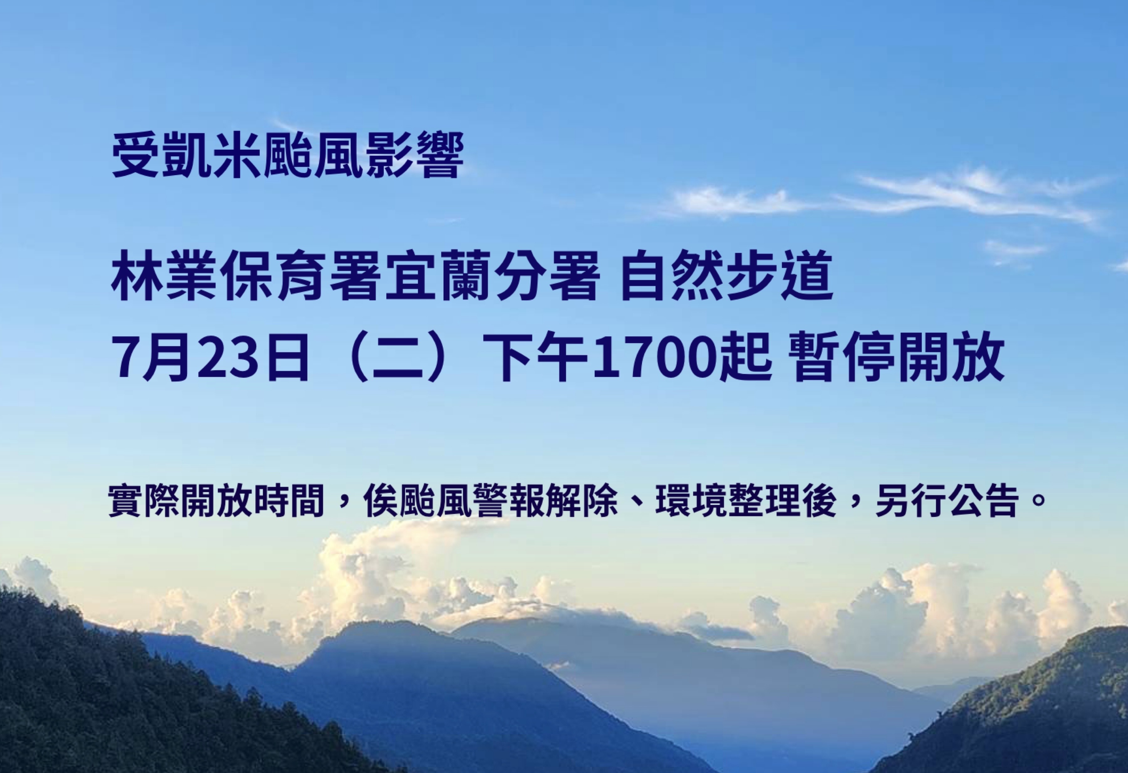 根據中央氣象署預報指出,輕度颱風「凱米」將於7月23日(週二)晚上至7月25日(週四)期間最接近臺灣,其中7月24日(週三)及7月25日(週四)的風雨最為猛烈,尤其臺灣東北部影響最為嚴重。為了保障遊客安全,林業及自然保育署宜蘭分署自7月23日下午起,暫停開放所轄社區型自然步道,包括金瓜寮魚蕨步道、礁溪跑馬古道、聖母登山步道、林美石磐步道、九寮溪自然步道、松羅步道、新寮瀑布步道、拳頭姆自然步道、朝陽步道、蘇花古道-大南澳越嶺段以及南澳古道。 依照中央氣象署預報,輕度颱風「凱米」的影響可能持續至7月26日(週五),步道實際恢復開放日期將依據颱風警報解除後,進行災害勘查和環境整備後再作動態調整。林業及自然保育署宜蘭分署提醒民眾,請隨時關注台灣山林悠遊網的最新開放資訊,尤其在颱風期間,應儘量減少戶外活動,避免前往山區步道,以保障自身安全。