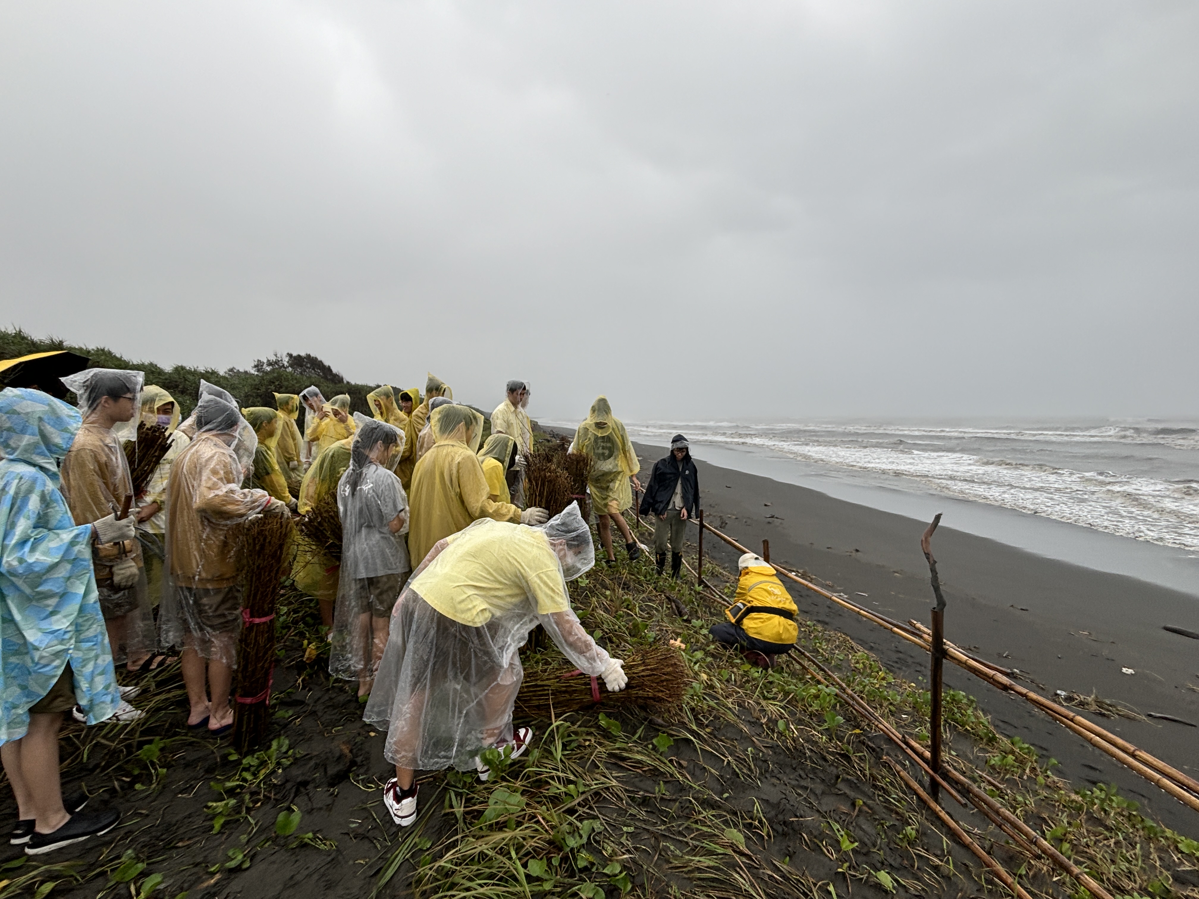 為因應宜蘭海岸面臨的強風、飛砂及海浪侵蝕問題,林業及自然保育署宜蘭分署積極營造海岸綠色防線,持續設置「堆砂籬」,打造一道有效攔截風沙的生態防線。113年11月6-7日由宜蘭縣羅東高中、東光國中共98名師生齊心協力,在五結的加禮宛保安林共同完成60公尺長的堆砂籬,為保護宜蘭的海岸生態邁出重要一步。 宜蘭地區長年受到強勁東北季風的影響,風沙和鹽霧常對沿海地區的居民生活造成威脅。堆砂籬能有效固定風沙,減少沙量流失,並為後方的保安林和濱海植被提供穩定的生長條件,成為海岸保護的關鍵措施。此次活動不僅讓學生參與其中,更讓他們透過實際行動了解海岸保護的重要性與環境永續的理念。 活動由羅東自然教育中心的環境教育講師帶領學生進行生態導覽,深入認識海岸保安林的生態價值。參與的學生以竹竿和竹樁搭建起堆砂籬,透過動手實作學習如何保護家鄉的海岸,也強化團隊合作精神與環境意識。結合環境教育與實地操作活動,不僅能讓下一代更深入了解海岸林的重要性,也能促進全民參與,共同守護我們賴以生存的自然環境,達到永續發展的目標。