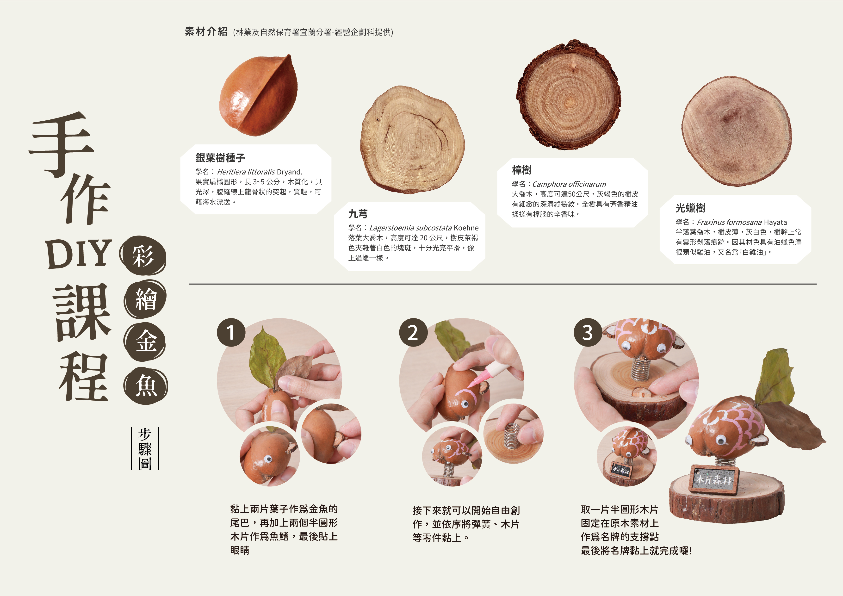 林業及自然保育署宜蘭分署為推廣森林資材再利用及木育活動,讓民眾透過親身體驗,親近木材、感受木材溫潤質地,同時注入美育學習,特別與知音文創產業股份有限公司在11月16-17日間在羅東林業文化園區推出限量自然素材DIY課程-彩繪金魚活動,活動課程共限量100份,邀請親子一同來羅東林業文化園區參與。 羅東林業文化園區,也稱羅東林場,園區內完整保存林業設施、聚落、貯木作業設施、載運機具等,同時也是宜蘭縣內著名的旅遊景點,園內綠意盎然、林木蔥蘢,今年因陸續受凱米及康芮颱風影響,園內植栽倒伏嚴重,林業保育署宜蘭分署在清理這些倒伏林木時,也思考如何讓原本要做為廢棄物清理的林木資材如何轉變為有教育價值的生物資源,宜蘭分署蒐集了樟樹、九芎及光臘樹段木和銀葉樹果實,結合知音文創產業股份有限公司的創意及美學,在木育森林羅東門市店內,規劃100份的自然素材DIY課程-彩繪金魚活動。 (一)11月16日「為保安林取名——你來決定!」模擬投票活動 為了讓大眾更貼近保安林的價值,並拉近在地居民與周邊森林的關係,林業及自然保育署近年來積極推動各地的「保安林命名」活動。11月16日上午09:00-12:00,在羅東林業文化園區遊客中心,由羅東自然教育中心主辦「為保安林取名——你來決定!」模擬投票活動,邀請遊客為宜蘭著名景點龜山島上的2707號保安林投票取名,選出心中最佳名稱。現場安排保安林主題導覽,並於完成票選後即可獲得自然素材DIY課程體驗名額,限量50份,期盼透過趣味互動,讓遊客了解保安林的珍貴價值。 (二)11月17日木育森林小學堂活動 11月17日於木育森林羅東店所舉辦的木育森林小學堂,透過木育知識影片賞析及木製遊憩設施體驗,讓遊客透過輕鬆有趣的活動,了解森林與木材的知識教育,同時感受木質素材的美好,活動自上午9點開始,於門市報名,限額50位。