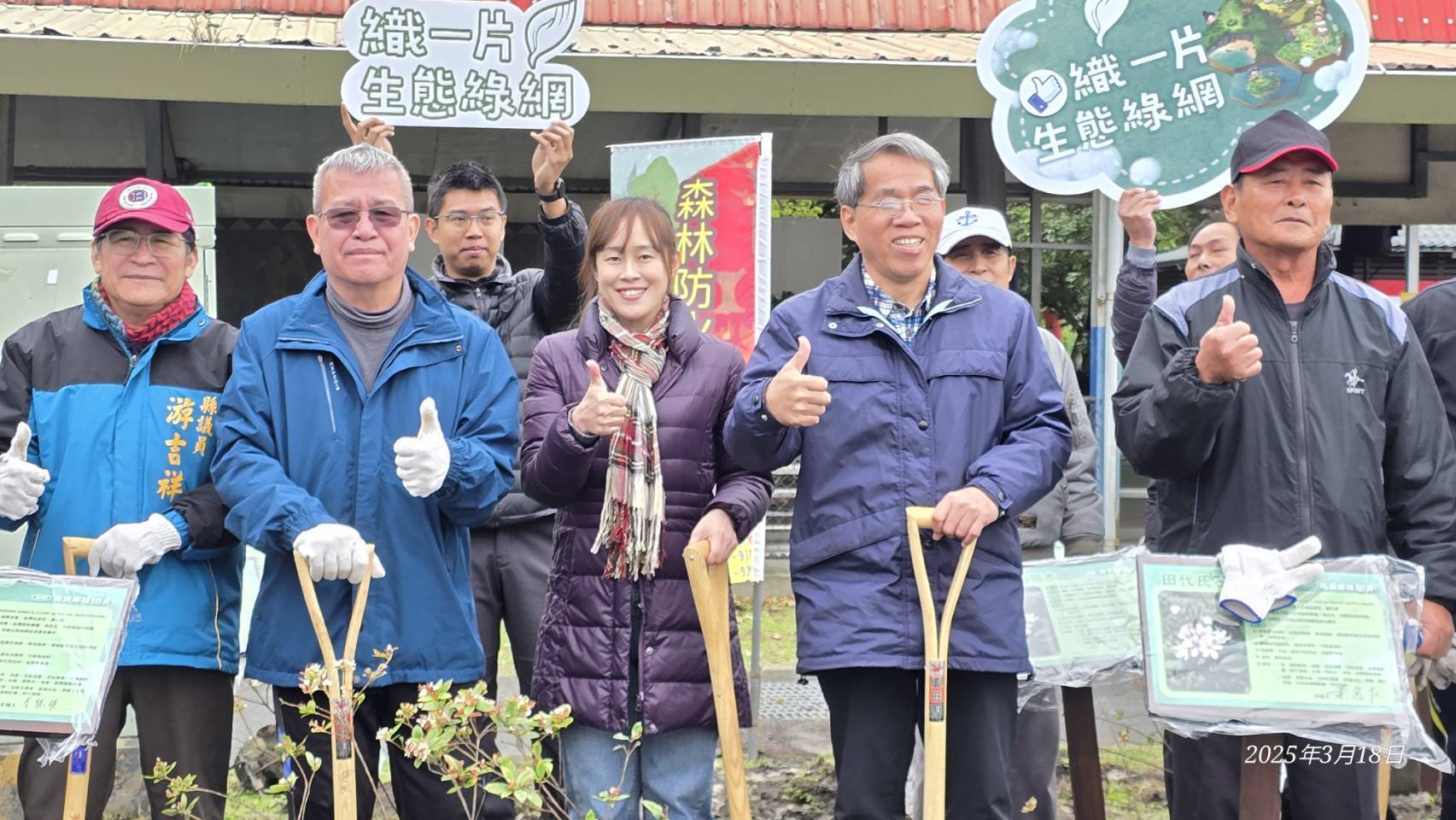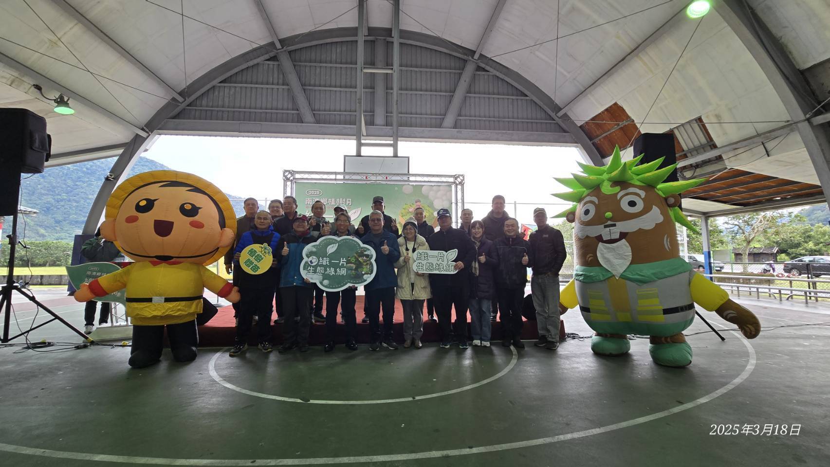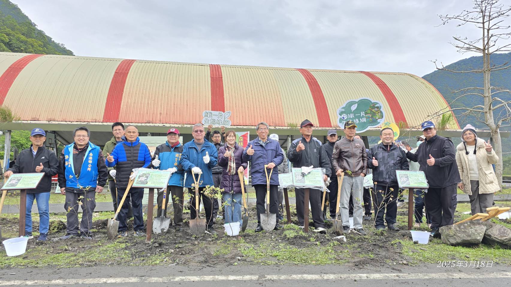 林業保育署宜蘭分署與南澳鄉公所於114年3月18日(星期二)上午10:30在南澳金岳村風雨藍球埸聯合舉辦「114年度植樹節-織一片生態綠網」植樹贈苗活動,宜蘭分署蕭分署長崇仁帶領分署及南澳工作站同仁與南澳鄉長李勝雄帶領各村長、南澳鄉民代表、在地鄉親共同參與。活動在金岳國小迎賓舞中熱鬧登場並由李鄉長勝雄、林業保育署分署長蕭崇仁一同栽植田代氏石斑木,為部落家園增色美麗容妝,讓我們共同守護這片美麗的土地,攜手邁向更加永續的未來。