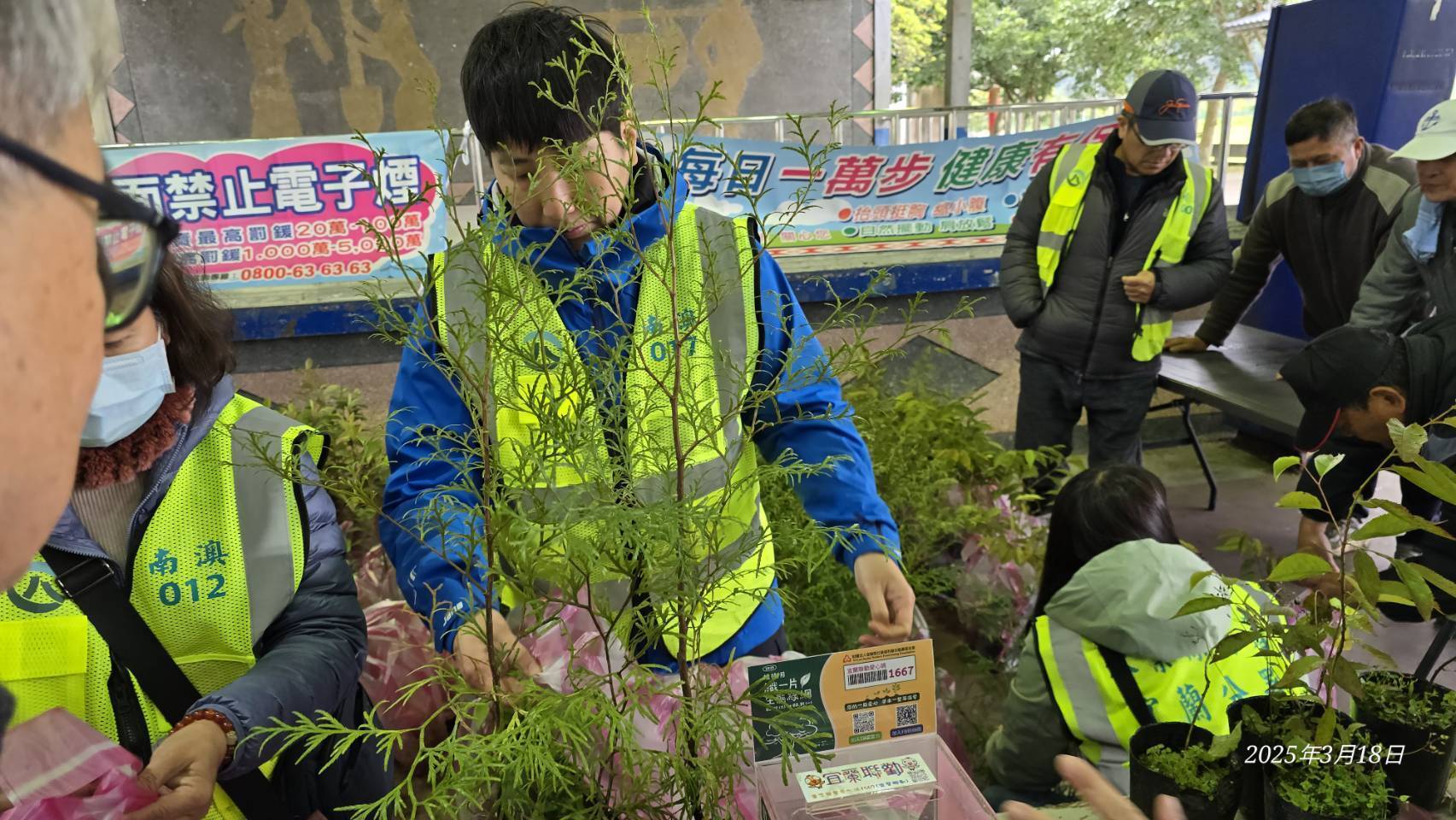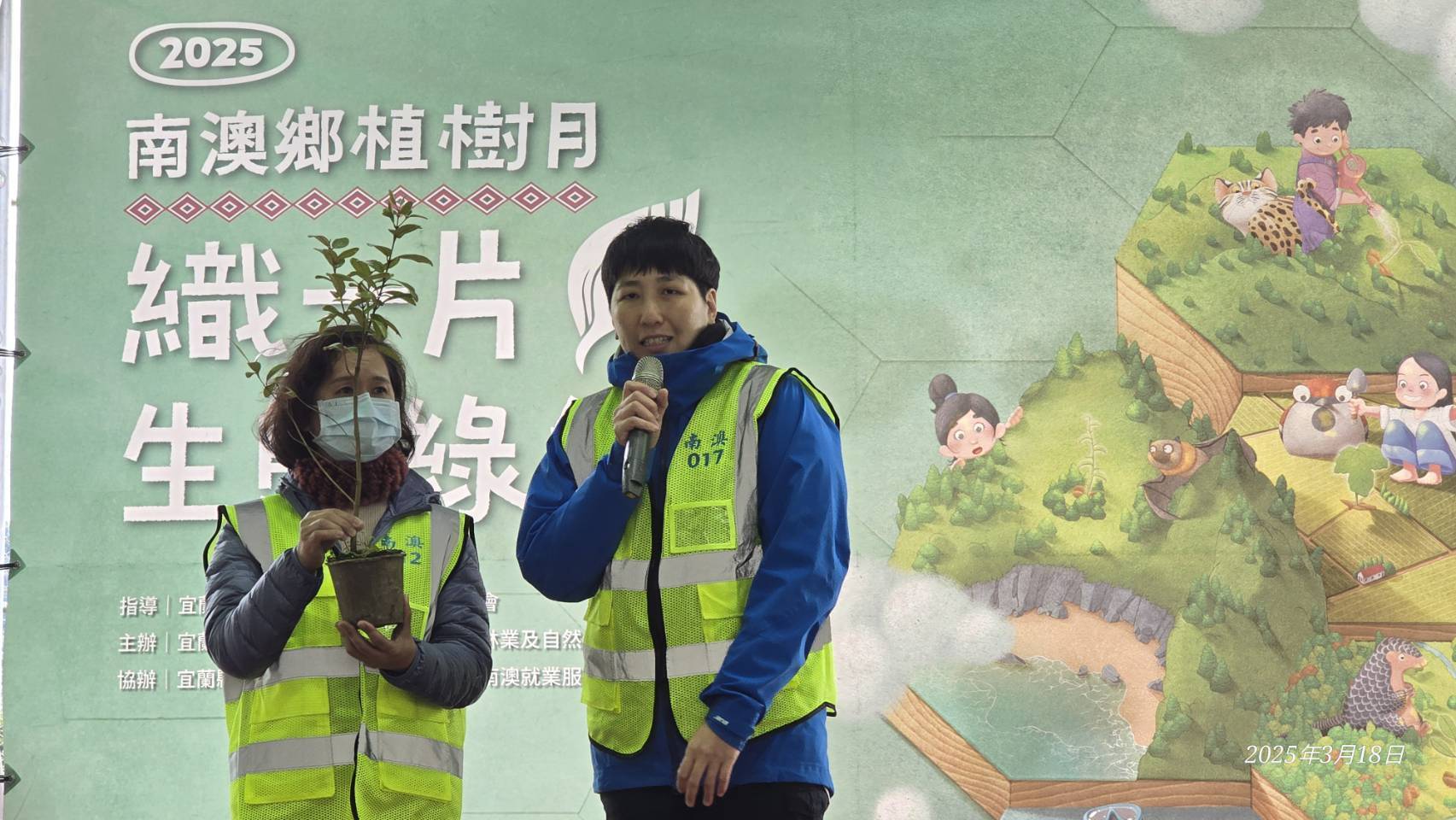 今日植樹活動由分署偶像團體-肖楠哥及打火勇哥帶領大家認識樹種並解說種樹技巧,讓南澳鄉親種下樹苗共同營造城市森活美學,為愛護地球、植樹造林盡一份力量,宜蘭分署並提供青岡櫟、山櫻花、肖楠、山黃梔、桃金孃等台灣原生種苗木共6OO株,為響應建置國土生態綠網,邀請民眾一起為地球集點樹,憑114年度1張發票兌換1株苗木,發票將全數捐予宜蘭縣社會福利聯合勸募基金會。活動吸引了來自各村的居民及當地原住民部落的積極參與,大家一同揮灑汗水,將一棵棵樹苗種下,為未來的綠色家園奠定基礎。