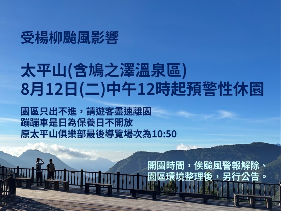 依據中央氣象署氣象資訊,預計今晚(11日)陸續發布楊柳颱風海上、陸上颱風警報,將影響台灣氣候。林業及自然保育署宜蘭分署考量太平山國家森林遊樂區聯外道路台七線、台七甲線、宜51線等,逢豪大雨恐有封閉、中斷之疑慮,顧及旅遊安全,因此園區(含鳩之澤溫泉區)訂於8月12日(星期二)中午12:00起預警性休園,區內8條自然步道:鳩之澤自然步道、見晴懷古步道、檜木原始林步道、鐵杉林自然步道、茂興懷舊步道、翠峰湖環山步道、望洋山步道、台灣山毛櫸步道同步封閉,原太平山俱樂部最後導覽場次為9:50,蹦蹦車是日為保養日不開放,園區只出不進,請遊客盡速離園。 另分署所轄社區型自然步道(計10條:包含林美石磐步道、礁溪跑馬古道、聖母登山步道、拳頭姆自然步道、新寮瀑布步道、九寮溪自然步道、松羅步道、朝陽步道、南澳古道、金瓜寮魚蕨步道)8月12日下午17:00暫停開放;羅東林業文化園區正常開園,倘宜蘭縣政府公告停止上辦上課時同步休園。 各場域實際恢復開園、開放日期,將視颱風警報解除後,進行災害勘查及環境整備,做滾動式調整。林業及自然保育署宜蘭分署請民眾隨時關注太平山官網,也提醒民眾颱風期間,減少戶外活動,請勿前往山區步道,以維安全。 ⛰️太平山官網: https://tps.forest.gov.tw/TPSWeb/wSite/mp 台灣山林悠遊網: https://recreation.forest.gov.tw/ 📱太平山官方FB粉專: https://www.facebook.com/tps100.forest?mibextid=ZbWKwL 📱太平山售票站:03-9809619