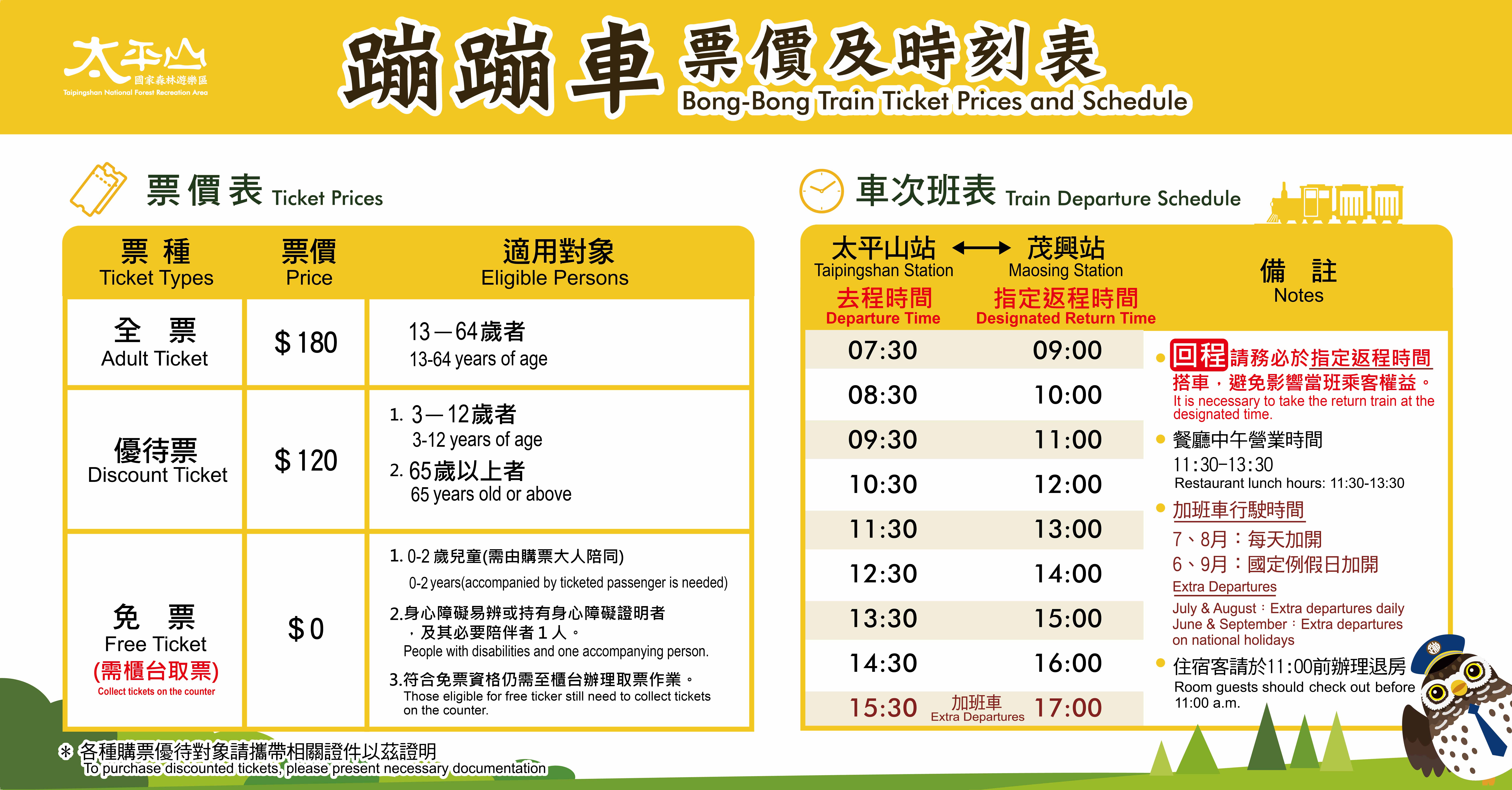 太平山國家森林遊樂區熱門的蹦蹦車去(113)年7月因凱米颱風受損後,歷經一年多的災害復建工程,將於114年10月1日起全線恢復通車,屆時遊客可再度搭乘蹦蹦車往返「太平山站—茂興站」,體驗森林鐵道魅力。 去年受颱風影響,帶來超過1,200毫米豪雨,造成蹦蹦車1.5K下邊坡嚴重崩塌、軌道路基流失。為了不讓喜愛蹦蹦車的遊客久候,林業及自然保育署宜蘭分署調整為提供1K路段局部復駛,隨後積極展開邊坡保護及鐵道更新等復建工程,因此為迎接114年10月1日全線恢復營運的遊憩品質、確保營運安全,太平山蹦蹦車將於114年9月18日至9月30日進行全線測試與人員訓練等工作,該期間蹦蹦車班次將調整為14:00為末班車,取消下午14:30、15:00與15:30班次。 擁有百年歷史的太平山蹦蹦車,將於10月1日再度全線重新開放「太平山站—茂興站」經典林業鐵道路線,帶領遊客穿梭於雲霧山林,重現行駛在森林裡的時光列車之美景,提供太平山站至茂興站往返遊程,宜蘭分署歡迎遊客安排搭乘太平山蹦蹦車,體驗森林生態之旅。 蹦蹦車相關資訊詳情可查詢 太平山官方FB粉絲團https://www.facebook.com/tps100.forest?mibextid=ZbWKwL 太平山國家森林遊樂區官網https://tps.forest.gov.tw/TPSWeb/wSite/mp 台灣山林悠遊網https://recreation.forest.gov.tw/ 或電洽太平山服務專線(03-9809805)及售票站(03-9809619)詢問。
