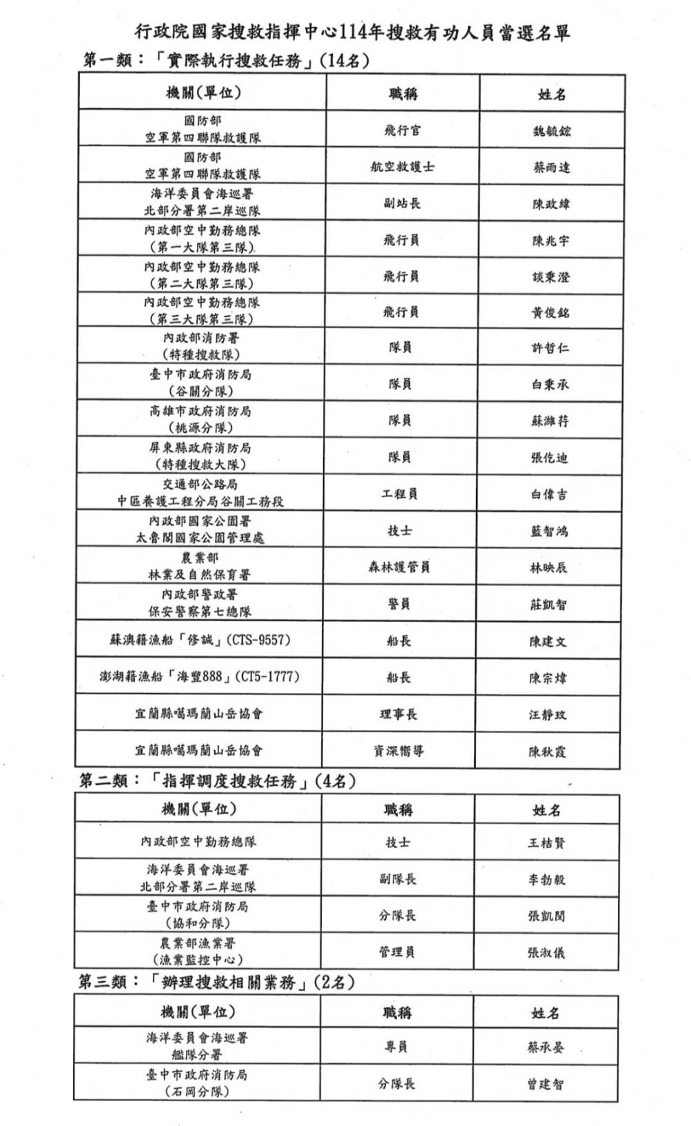 行政院國家搜救指揮中心於今(3)日舉行「114年度搜救有功人員表揚典禮」,經由各搜救相關機關內部評選及提報後,遴選出20位在陸、海、空等不同領域中表現傑出的搜救人員。林業及自然保育署宜蘭分署太平山工作站森林護管員林映辰,長年協助山域搜救任務,以其專業與熱忱成為林業及自然保育署唯一獲獎代表,並由行政院卓榮泰院長親自頒獎表揚。 林映辰任職於林業保育署宜蘭分署,熱愛山林且熟悉轄內各熱門山域路徑。自111年至114年間,多次協助消防單位進入深山執行搜救任務,提供精確山域軌跡、地形判讀與路線研擬,協助消防局勤務中心制定搜救策略。憑藉其卓越的地圖判讀與地形分析能力,多次成功抵達迷途山友位置,協助救回多名迷途或受傷登山客。本次獲國家級表揚,除肯定其專業表現外,更激勵了第一線護管與救援人員的士氣。 為彰顯民間搜救團體在搜救任務中的關鍵角色,行政院國家搜救指揮中心今年首度開放提報民間團體及個人搜救有功人員,藉以肯定民間力量在搜救行動中的重要貢獻。本次宜蘭縣噶瑪蘭山岳協會及該會資深嚮導陳秋霞小姐雙雙獲獎,充分展現公私協力的成果。 噶瑪蘭山岳協會長年協助宜蘭縣消防局投入山域搜救工作,並與林業及自然保育署宜蘭分署合作推動山徑與步道認養維護計畫。透過定期巡查步道、通報設施損壞與維修報告,降低山友迷途風險,實質減少山難事件發生,展現民間團體與政府單位攜手守護山林安全的典範。 噶瑪蘭山岳協會資深嚮導陳秋霞小姐於109年空軍黑鷹直升機墜落烘爐地山區案中,憑藉長年山林經驗與地形研判能力,在事故地點不明的情況下,第一時間抵達失事現場,引導軍、警、消及林業單位進入救援。其迅速行動使搜救隊伍於兩個半小時內抵達現場,成功救出5名傷者,儘管仍有8名將官不幸罹難,其冷靜判斷與勇敢行動,獲得各界高度肯定。此後,陳秋霞小姐持續投入多起宜蘭地區山域搜救行動,成為地方山域安全的重要支柱。 林業及自然保育署宜蘭分署近年積極推動山域安全措施,針對轄內熱門登山路線,如太加縱走、松羅湖、巴博庫魯山及阿玉山等山徑,設置完善標示系統,有效降低迷途案件發生。同時,輔導在地NGO團體參與步道認養,並與電信公司合作測試及設置通訊標誌,將通訊點與里程標資訊整合至登山離線地圖「魯地圖」(https://rudymap.tw/app),協助民眾行前準備與即時通報,提升搜救效率,減少事故發生率。