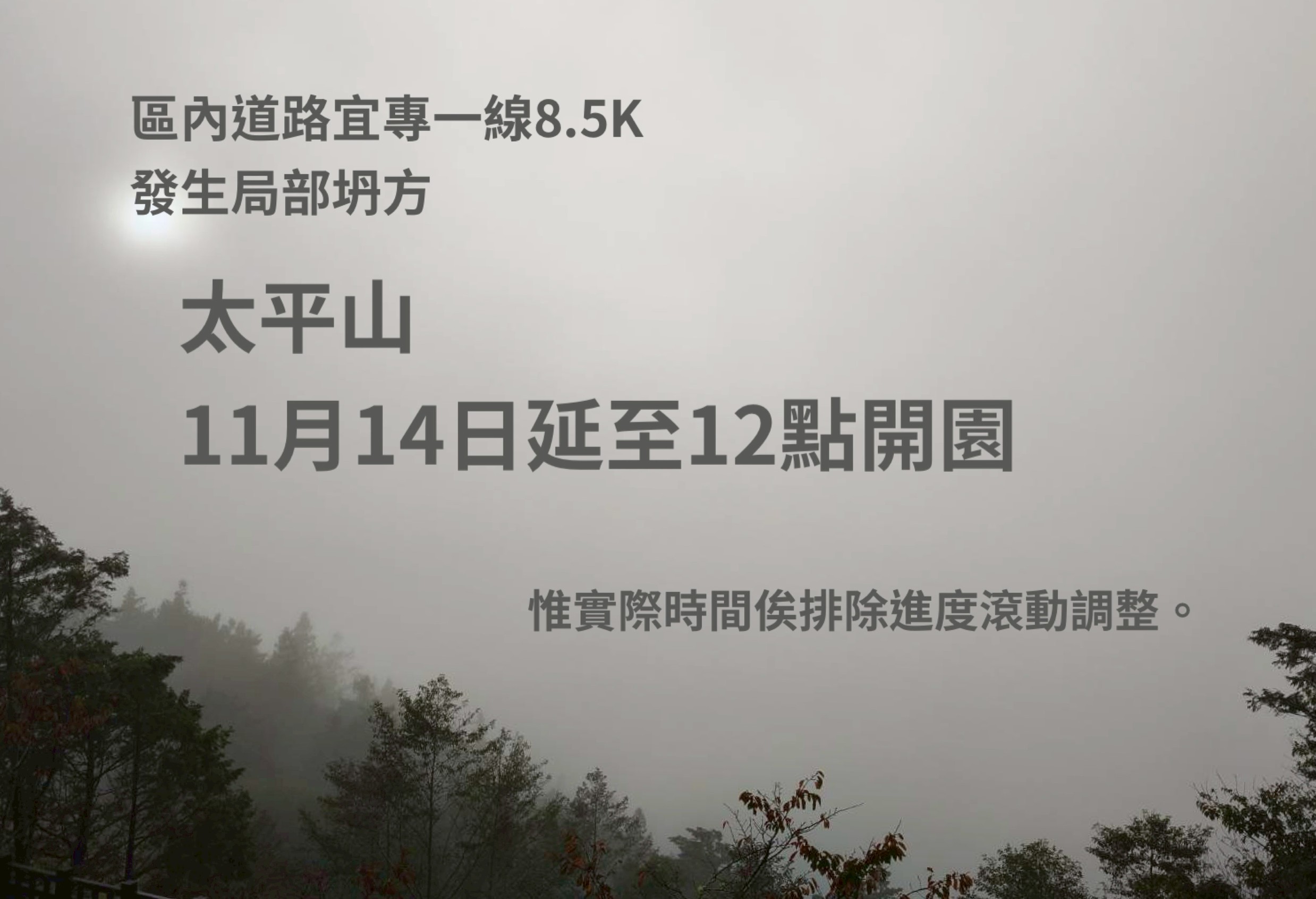 太平山國家森林遊樂區內道路「宜專一線」8.5k處,在今(14)凌晨,發生上邊坡土石崩塌,造成交通雙向受阻,經工作人員進行初步勘查後,預定於12點搶通,因此,開園時間將由上午8:00延後至12:00,惟實際開園時間仍需視災害搶修情形進行滾動式調整。 相關資訊查詢可上太平山官方FB粉絲團(https://www.facebook.com/tps100.forest)、太平山官網(https://tps.forest.gov.tw/TPSWeb/wSite/mp) 或電洽太平山入口售票站03-9809619