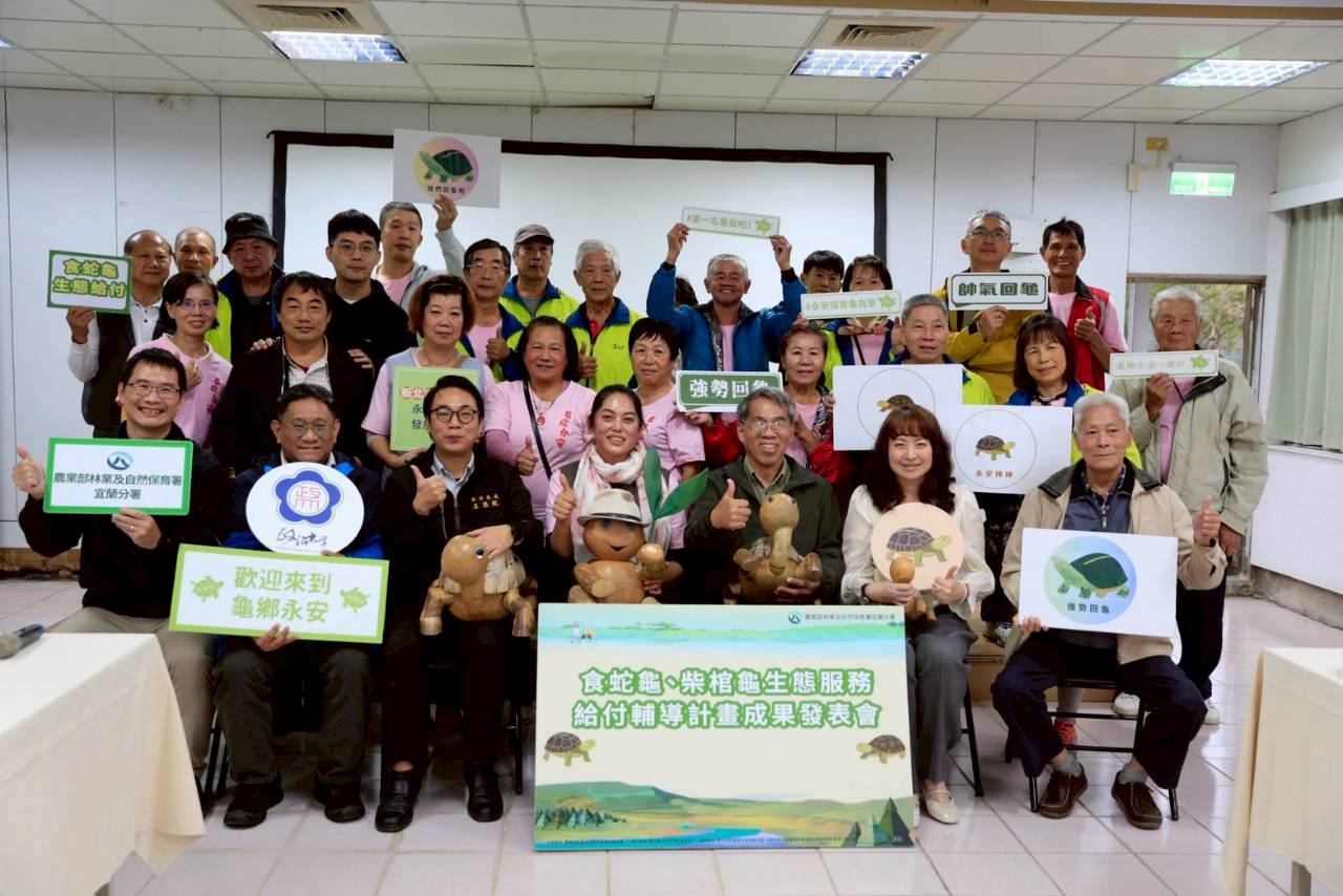 林業保育署宜蘭分署與新北市石碇區永安社區攜手推動的「食蛇龜及柴棺龜生態服務給付示範計畫」已邁入第二年,並展現亮眼成效。11月25日於石碇雲海國小永安國小分校(永安市民活動中心)舉辦的成果發表會中,不僅可見社區居民成為保育第一線守護者的努力,更因參與生態服務給付茶園,當地友善耕作茶農與新北市政府農業局、國立政治大學USR辦公室公同合作推出「龜茶Good Day禮盒」,成功創造逾50萬元銷售額,展現生態保育與農民收益兼具的永續模式。為維護瀕危保育類野生動物棲地,政府亦以「生態薪水」概念提供「友善農地給付」及「巡護監測給付」兩項支持,鼓勵農民與居民共同投入保育行動,發表會當日,除永安里社區夥伴分享棲地營造與巡守經驗外,並帶領與會人員踏查生態給付田區,展現出地方保育成果。 永安社區巡護監測中,參與生態服務給付的農友在田間發現食蛇龜與柴棺龜剛孵化之幼龜。經龜類專家研判,該區域的確為這兩種保育龜類的重要繁殖棲地。幼龜的出現,直接證實了透過生態給付引導農友轉型友善耕作,已成功為保育類龜類營造出安全、適宜的繁衍環境。 有鑑於113年度的成果豐碩,今114年度社區夥伴參與度更加踴躍。根據統計,目前共計有28位在地農友申請生態服務給付,其中食蛇龜22案、柴棺龜6案,友善農地面積已近 6.3公頃,較113年度新增 0.51公頃;另外社區居民也組成巡守隊,並對永安里內食蛇龜、柴棺龜出沒的潛在熱點作不定時巡視,預計今年生態給付發放的給付金額將達 68萬元,較上年度增加 10.6萬元。這不僅是數字的成長,更象徵著在地居民對生態保育認同感的提升 林業保育署宜蘭分署蕭崇仁分署長指出,保育工作除關注野生動植物的存續,更須兼顧在地居民的生活與生計,唯有讓保育成為可在地實踐的行動,才能真正擴大食蛇龜及柴棺龜的保育成果。此次活動也象徵公部門、學界與社區攜手合作,共同寫下生態保育的新篇章。