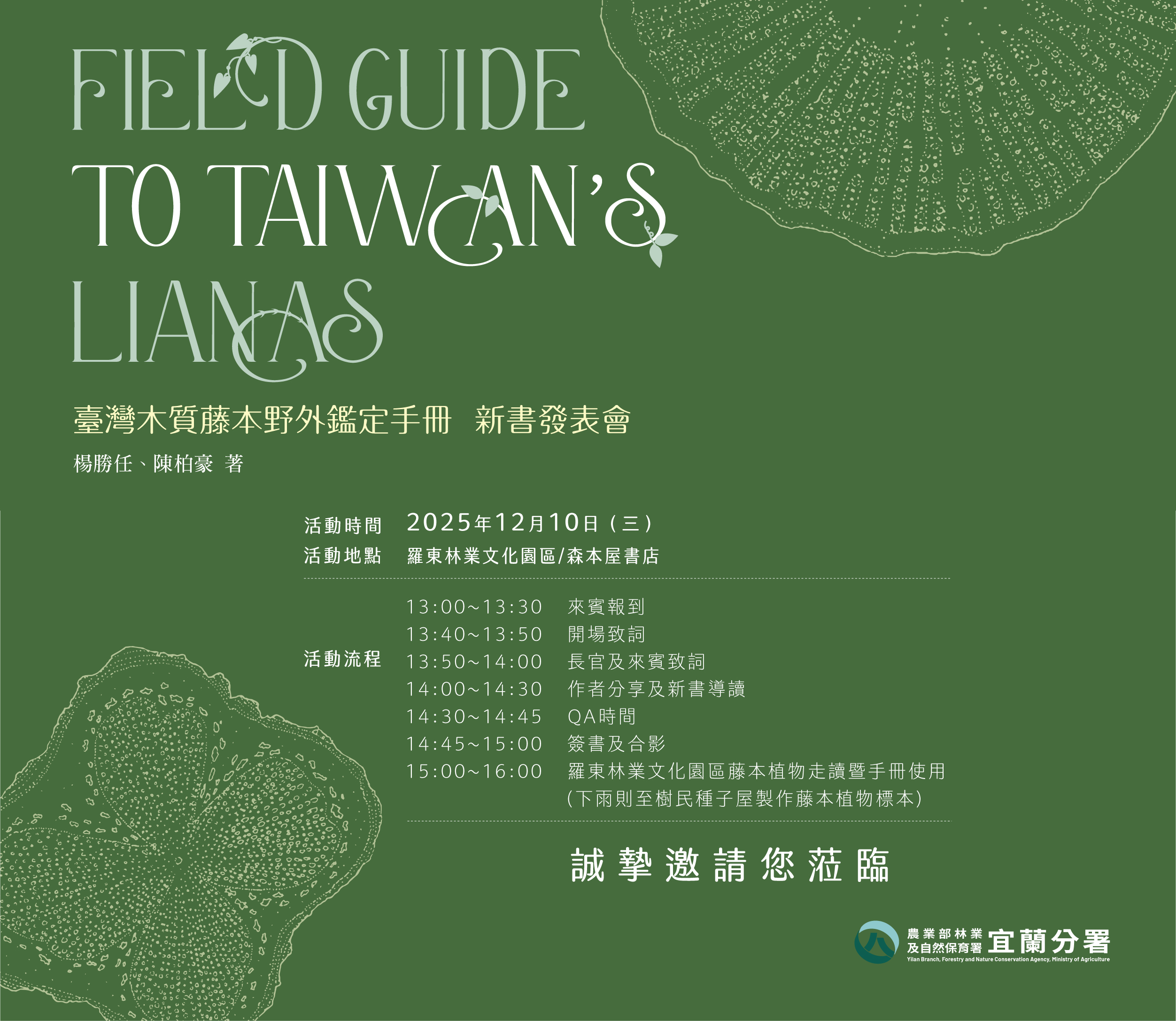 林業及自然保育署宜蘭分署將於114年12月10日(星期三)13時至16時,於羅東林業文化園區「森本屋」書店舉辦新出版品《臺灣木質藤本野外鑑定手冊》新書發表會,邀請關注森林生態、步道旅遊與自然教育的民眾共襄盛舉,一同認識臺灣多樣而迷人的木質藤本植物。 宜蘭分署曾於110年出版《臺灣木質藤本多樣性》一書,系統性介紹臺灣206種木質藤本植物,為進一步充實藤本植物知識與應用面向,並深化與民眾生活連結,分署於113年爭取農再計畫,邀請屏科大榮譽教授楊勝任老師辦理「臺灣藤本植物與民俗使用撰寫暨出版計畫」,將收錄種類大幅擴增至301種,並完成出版《臺灣木質藤本野外鑑定手冊》,提供更貼近實地觀察需求的辨識資訊,成為野外調查、解說導覽及親近自然的實用工具書。 宜蘭分署指出,藤本植物廣泛分布於山林、溪谷及步道林緣,不僅是森林生態的重要成員,也常與地方生活及傳統利用緊密相連。本次辦理新書發表會,期望透過新書導讀與交流,強化自然步道導覽解說素材,推廣森林生態旅遊,並提升大眾對森林植物多樣性與保育價值的認識。