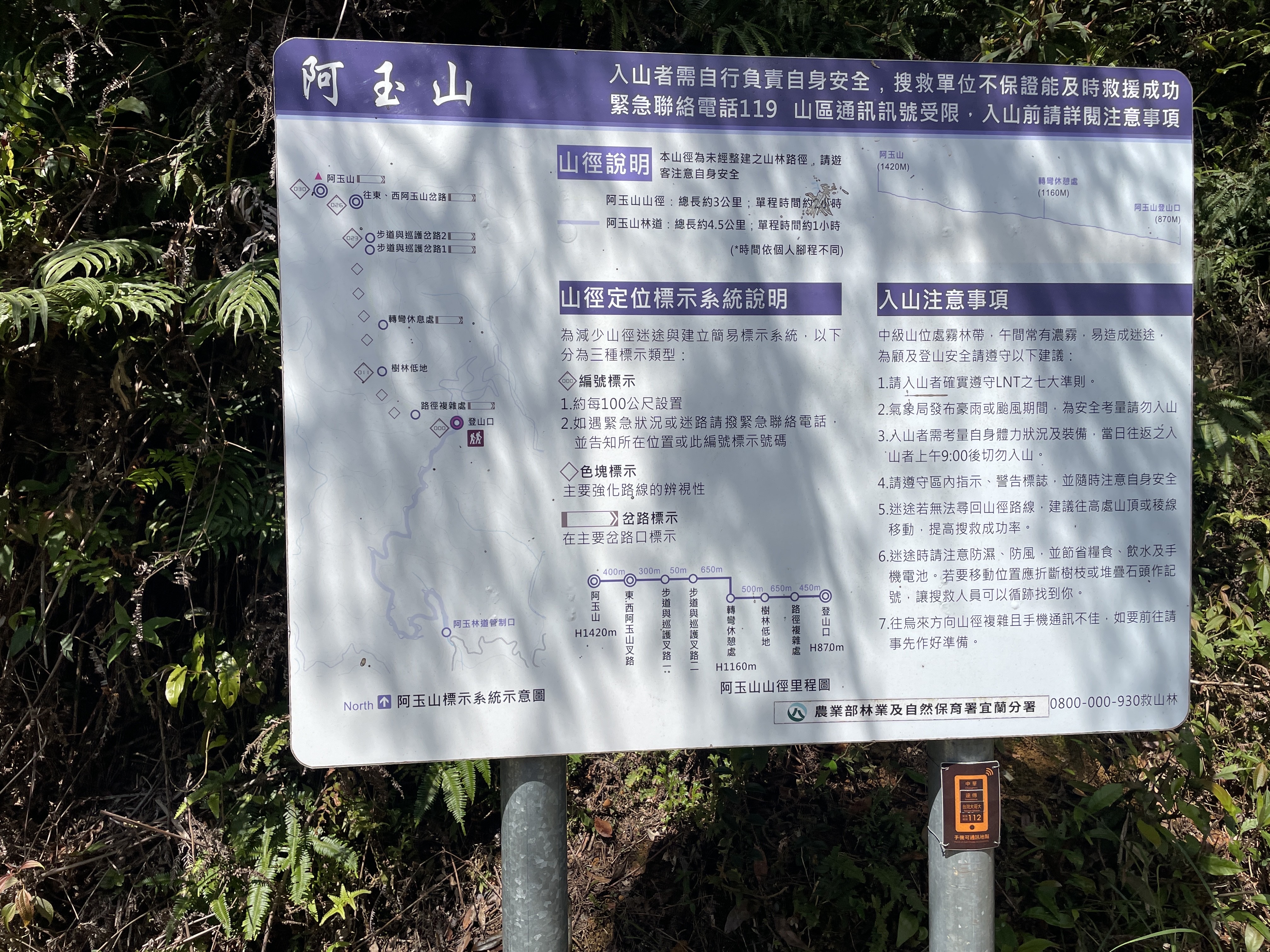 林業及自然保育署宜蘭分署所轄阿玉山山徑於104年設置全臺第一條山徑標示系統,山徑全線3公里,每100公尺設置1面里程牌,並於重要轉角及叉路口設置反光指標,有效提升山友辨識度並降低迷途風險。此作法推行後大幅減少山域事故發生,也成為各山域管理單位與步道認養團體設置山徑路標的重要參考模式。 鑑於114年10月曾有山友於阿玉山區發生山域事故,宜蘭分署與民間單位合作研擬精進措施,並邀集電信業者台灣大哥大進行山區訊號弱場測試與基地台訊號覆蓋調整。115年3月中旬完成現地實測結果顯示,山徑沿線31處(0~3公里)里程牌位置皆可接收通訊訊號,整體登山路線已具備電信訊號覆蓋,有助於提升山域緊急通訊能力。 宜蘭分署也於阿玉山林道每500公尺加設里程牌,自林道口至阿玉山山徑登山口計4.5公里,維持林道暢通作為山域緊急救援通道。山徑相關通訊資料每年彙整提供林業及自然保育署作為政府開放資料「山區手機可通訊點標示資訊」,供電信業者更新與民眾登山通訊參考使用。同時也與臺灣登山常用離線地圖「魯地圖」合作更新資訊,讓山友透過離線地圖即可掌握所在里程位置與通訊情形。 此外,臺灣戶外運動服飾品牌kawas嘉瓦士有限公司/社團法人台灣嘉瓦士文化協會已與宜蘭分署簽訂阿玉山山徑認養契約,並與台灣大哥大合作進行現地勘查,將本次調查紀錄轉換為坐標資料,預計於暑假前全面更新山徑里程牌資訊及加註坐標資訊,持續完善山域指標系統。 阿玉山為蘭陽五岳之一,景觀優美,深受山友喜愛。宜蘭分署提醒,進入山域活動前應做好行前準備,包括掌握天候資訊、規劃登山行程與安全裝備、下載離線地圖並留意沿線路牌及通訊資訊,同時指定留守人員掌握行程,以確保登山安全。 相關資訊 1.林業保育署山區手機可通訊點標示資訊 https://www.forest.gov.tw/0004548/0073591 2.手機離線地圖魯地圖https://rudymap.tw/app 3.社團法人台灣嘉瓦士文化協會 https://www.tkca.org.tw/ 4.嘉瓦士有限公司https://www.kawas.tw/